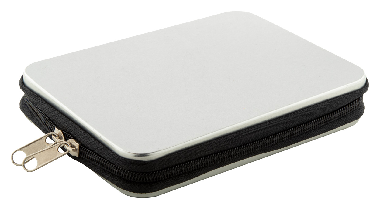 25-częściowy metalowy zestaw narzędzi w aluminiowej walizce z suwakiem. Zawiera: szczypce, szczypce tnące, śrubokręt nasadowy, przedłużacz, pęsetę, 6 wkrętaków precyzyjnych, 4-częściowy zestaw nasadek, 10-częściowy zestaw końcówek wkrętakowych.