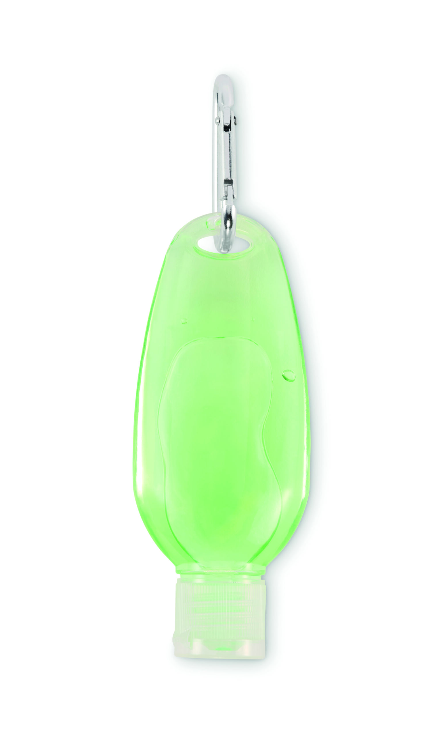 Żel z aloesu w 50 ml butelce PET wielokrotnego napełniania z zakrętką PP i aluminiowym karabińczykiem. Przezroczysty zielony żel, idealny do użytku w podróży.