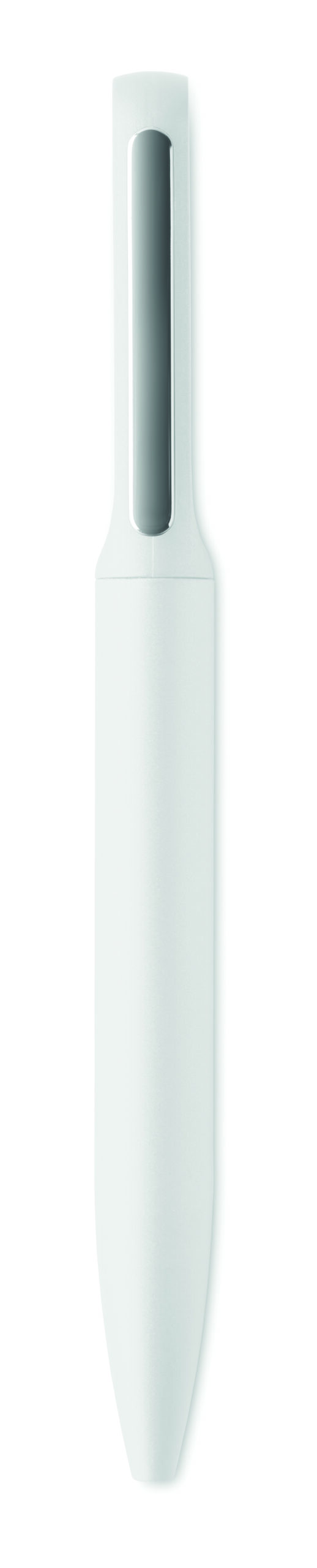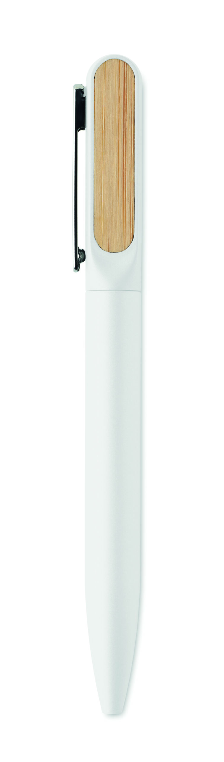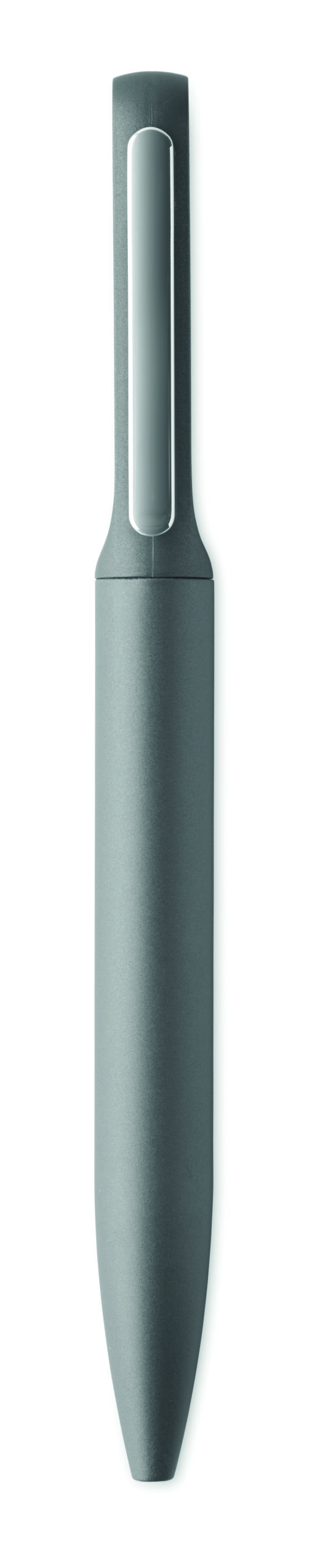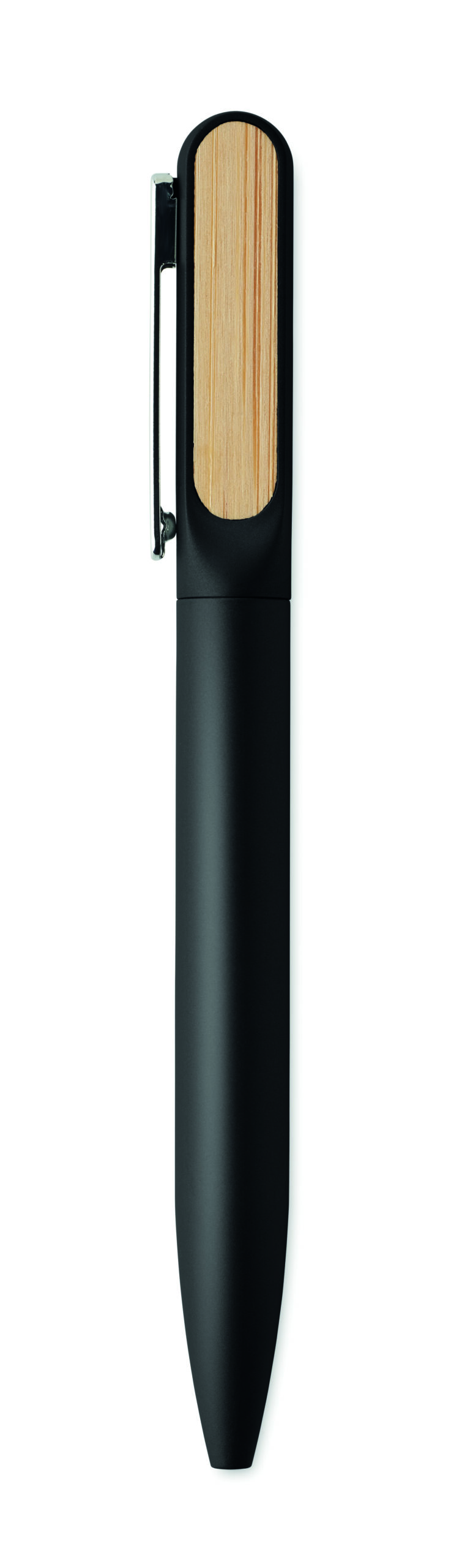Obrotowy długopis z aluminiowym korpusem z recyklingu, częścią obrotową z recyklingowanego ABS i metalowym klipsem z bambusowym detalem. Niebieski tusz.
