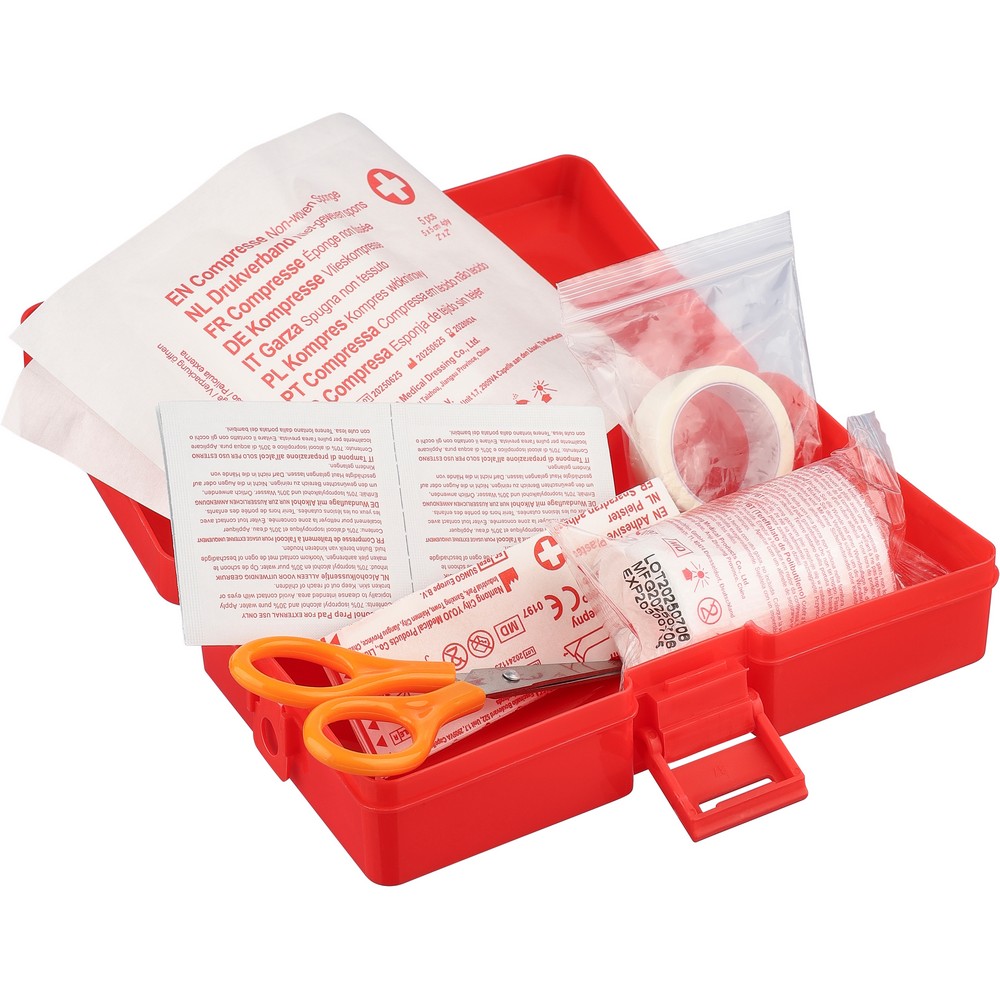 Apteczka, zapięcie na klips, czerwony pojemnik z białym krzyżem, gąbki (2 szt.), opatrunki (5 szt.), gaziki nasączone alkoholem (4 szt.), nożyczki, rolka bandażu (450 cm), taśma (450 cm), produkt wykonany z PP, PE i poliestru