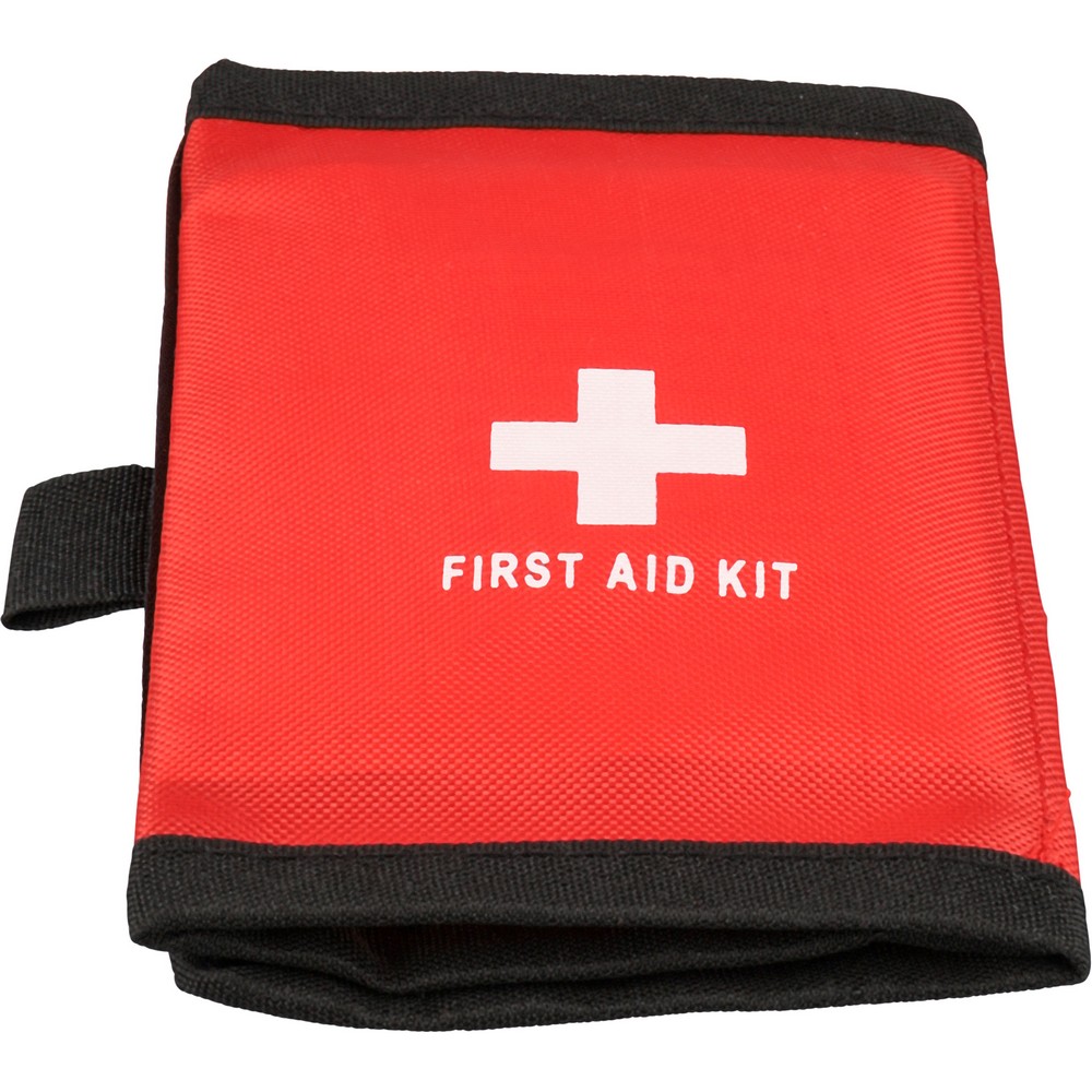 Apteczka, zapięcie na rzep, pasek ułatwiający noszenie, kieszenie wewnętrzne, ikona RPET na metce, plastry (5 szt.), jałowy opatrunek, gąbka, gaziki nasączone alkoholem (8 szt.), wilgotne chusteczki (2 szt.), produkt wykonany z PE, PVC, PU i RPET 600D