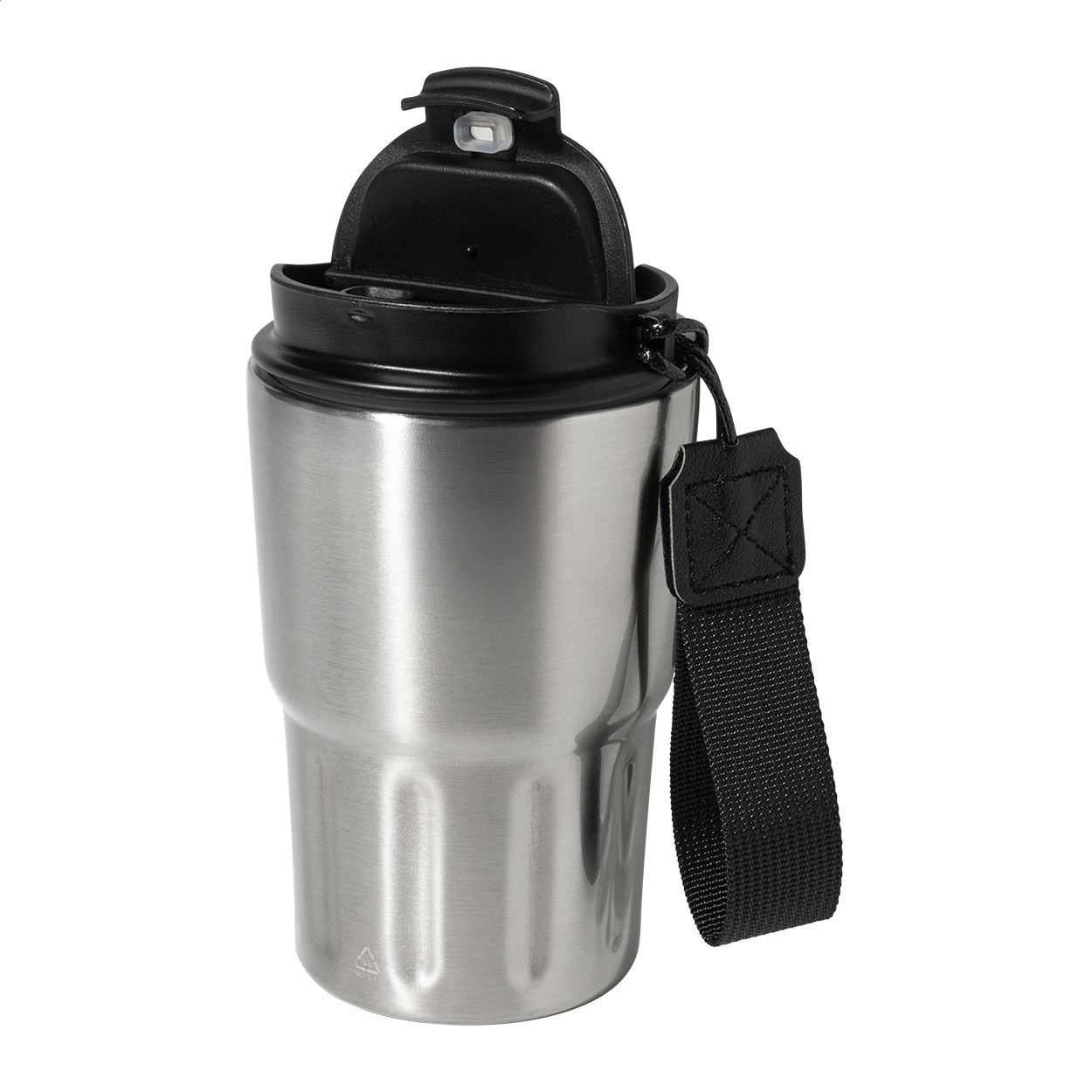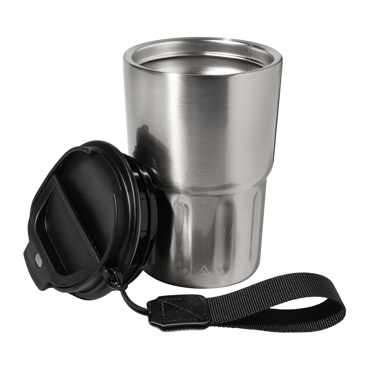 Kubek termiczny z podwójną ścianką, wykonany z recyklingowanej stali nierdzewnej, z pokrywką z PP. Z paskiem do przenoszenia z poliestru RPET. Pojemność 350 ml.