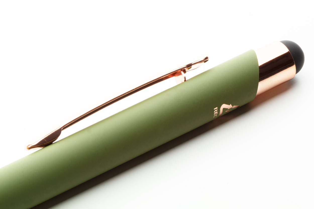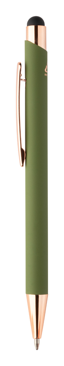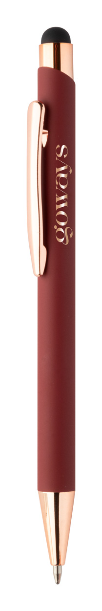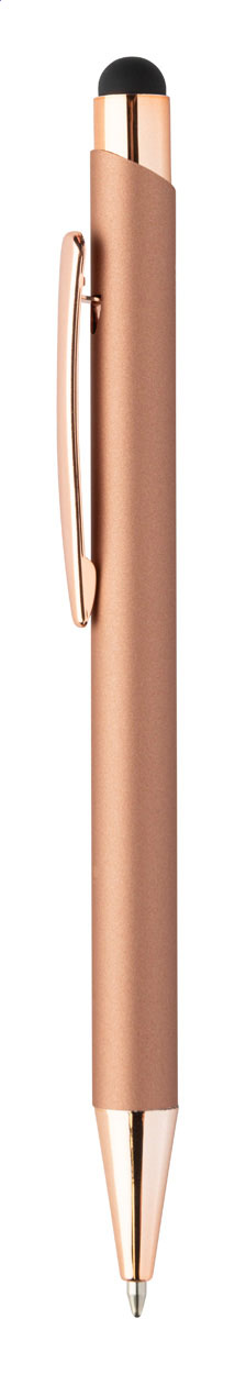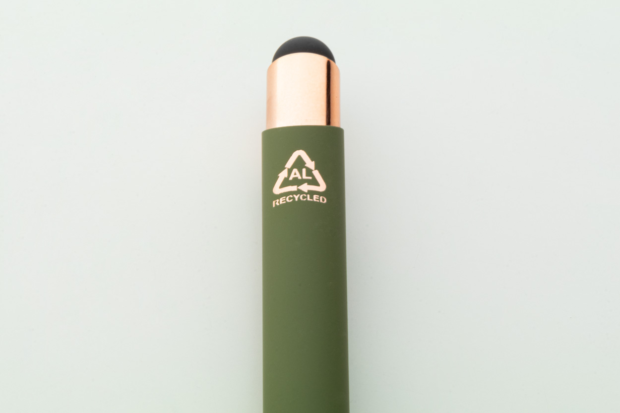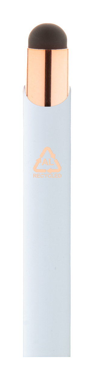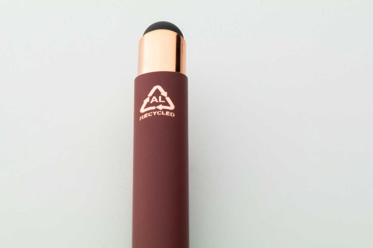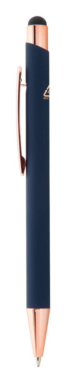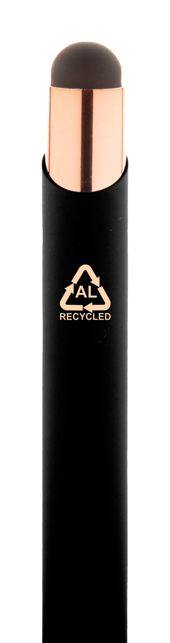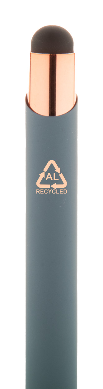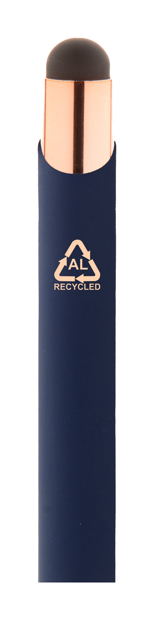 Długopis z aluminium pochodzącego z recyklingu i końcówką do ekranów dotykowych z gumowanym wykończeniem i elementami w kolorze różowego złota. Ze specjalną powłoką pod grawer lustrzany w kolorze różowego złota. Niebieski wkład.