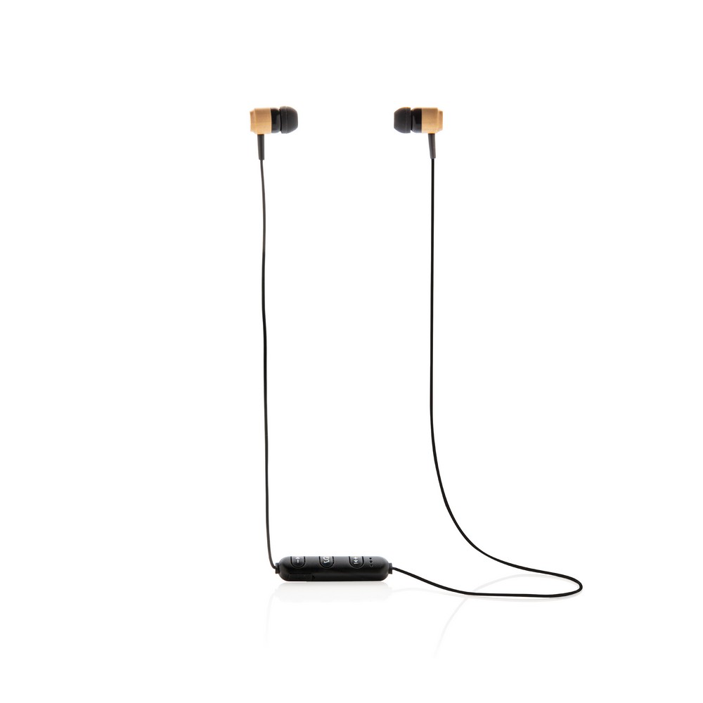 Słuchawki bezprzewodowe BT 5.0, douszne, wykonane z bambusa, magnetyczne końcówki, wbudowany akumulator 55 mAh umożliwia odtwarzanie muzyki do 3 godzin, ponowne naładowanie w 1 godzinę, zasięg do 10 m, nakładki w 3 rozmiarach i ekologiczne etui w komplecie