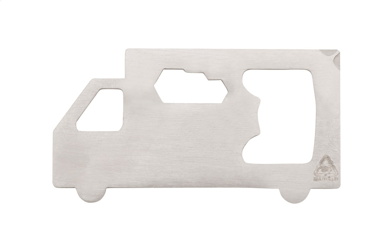Wielofunkcyjne narzędzie w kształcie ciężarówki, wykonane ze stali nierdzewnej z recyklingu, z otwieraczem do butelek, śrubokrętem krzyżakowym i trzema kluczami płaskimi.