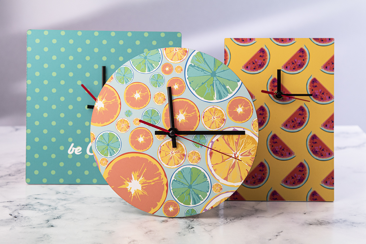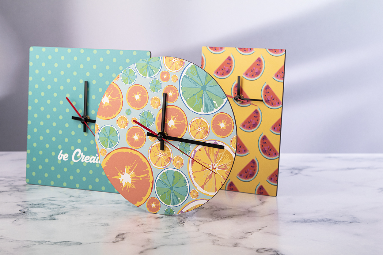 Personalizowany, wykonany z drewnianej płyty HDF, okrągły zegar ścienny z grafiką. Produkt działa na 1 baterie AA, dostarczany bez baterii. Min. zam.: 50 szt.