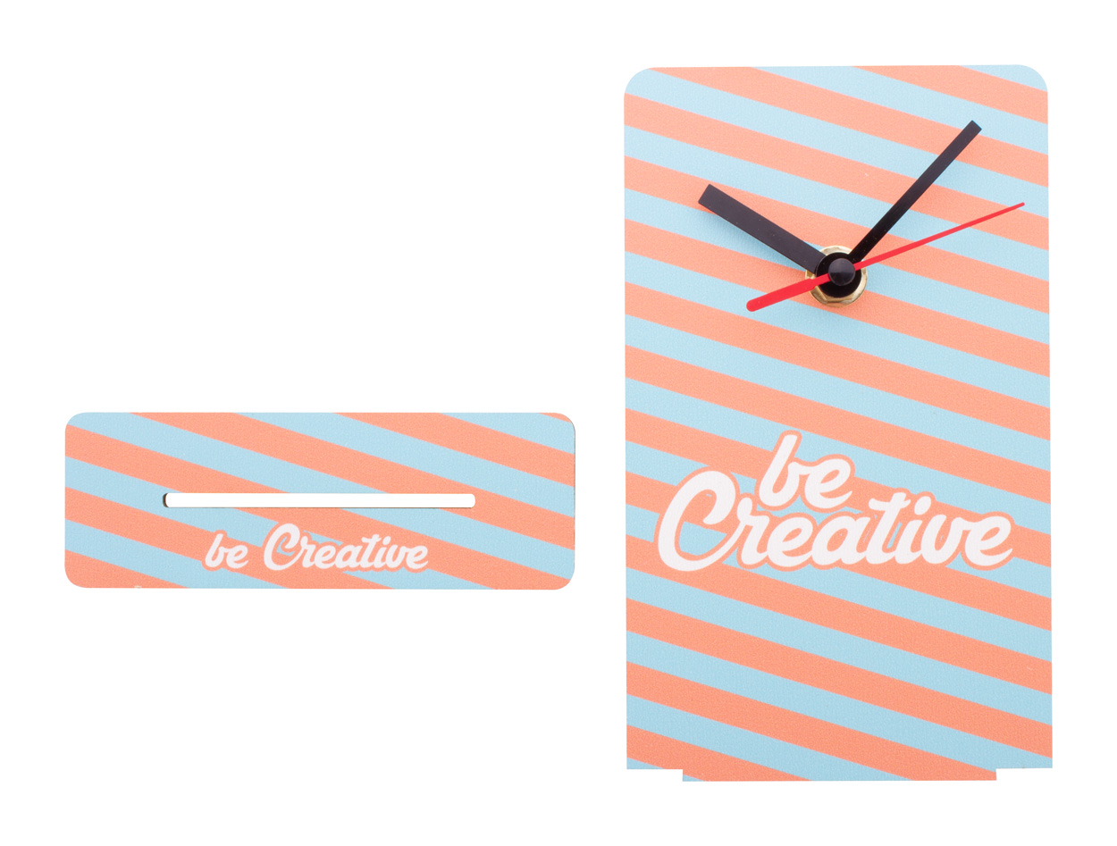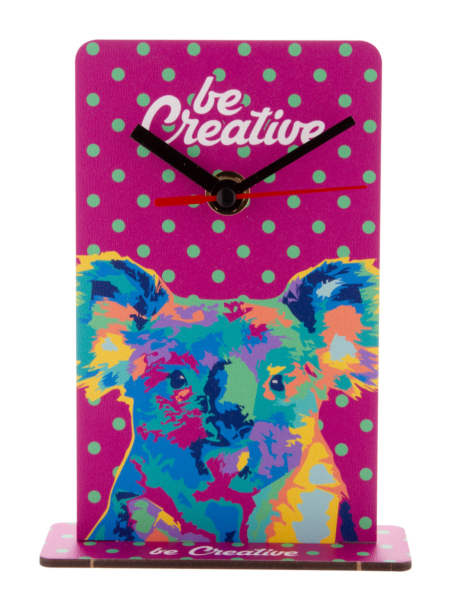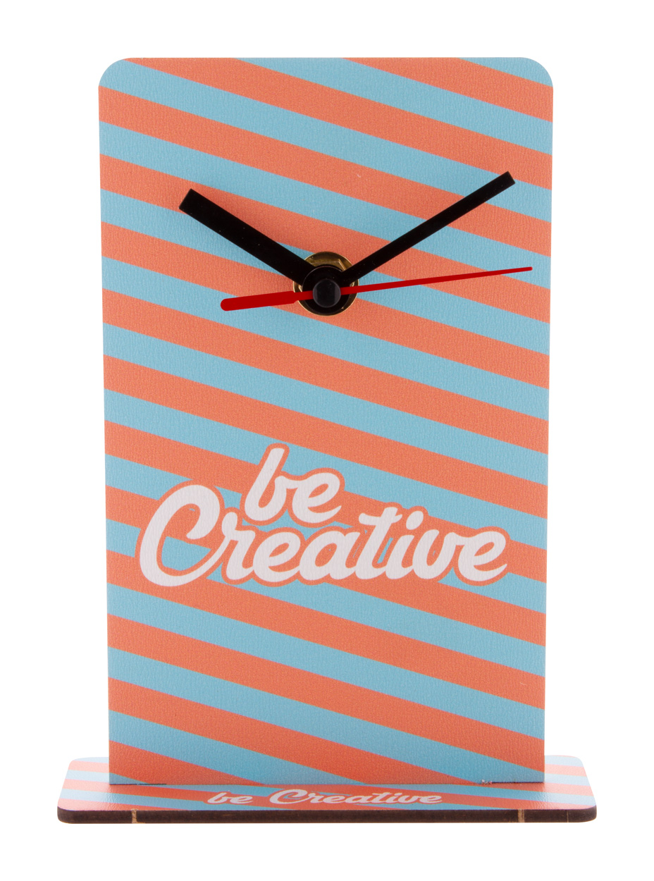 Wykonany na zamówienie drewniany zegar stołowy HDF z personaliowaną grafiką. Działa z 1 baterią AA, bez baterii w zestawie. Min. iość: 50 szt.