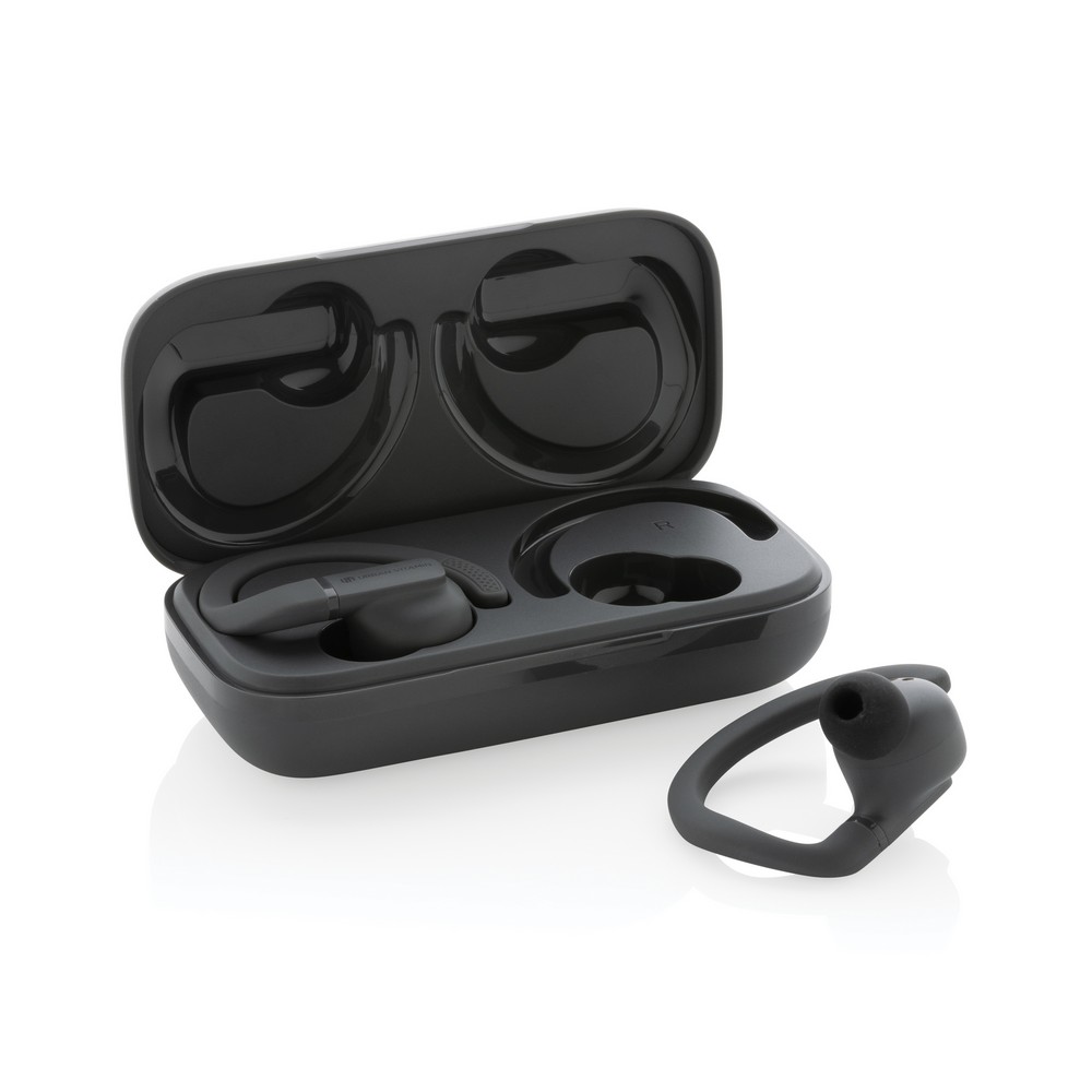 Bezprzewodowe słuchawki douszne, BT 5.3, wykonane z ABS oraz TPE z recyklingu z certyfikatem RCS, całkowita zawartość materiałów z recyklingu obliczone na podstawie wagi całkowitej przedmiotu: 55%, funkcja redukcji szumów otoczenia podczas rozmów (ENC), wodoodporne IPX5 (całkowita ochrona przed strumieniem wody płynącej z różnych kierunków z wydajnością do 12,5 litra na minutę), dotykowy panel sterowania, do 8 godzin odtwarzania na jednym ładowaniu, etui ładujące 600 mAh pozwala na trzy pełne cykle ładowania słuchawek, nie zawiera PVC, opakowanie o zmniejszonej zawartości plastiku, ślad węglowy produktu: 1,41 kg CO2