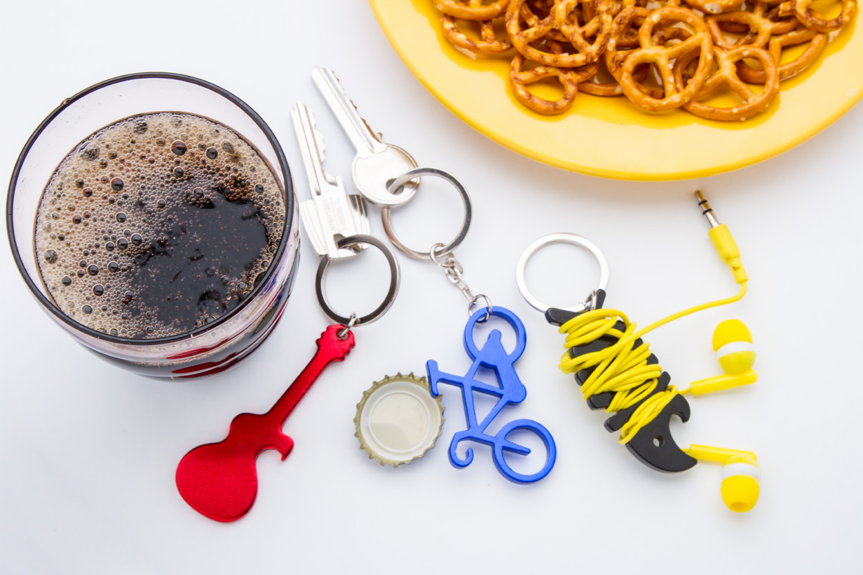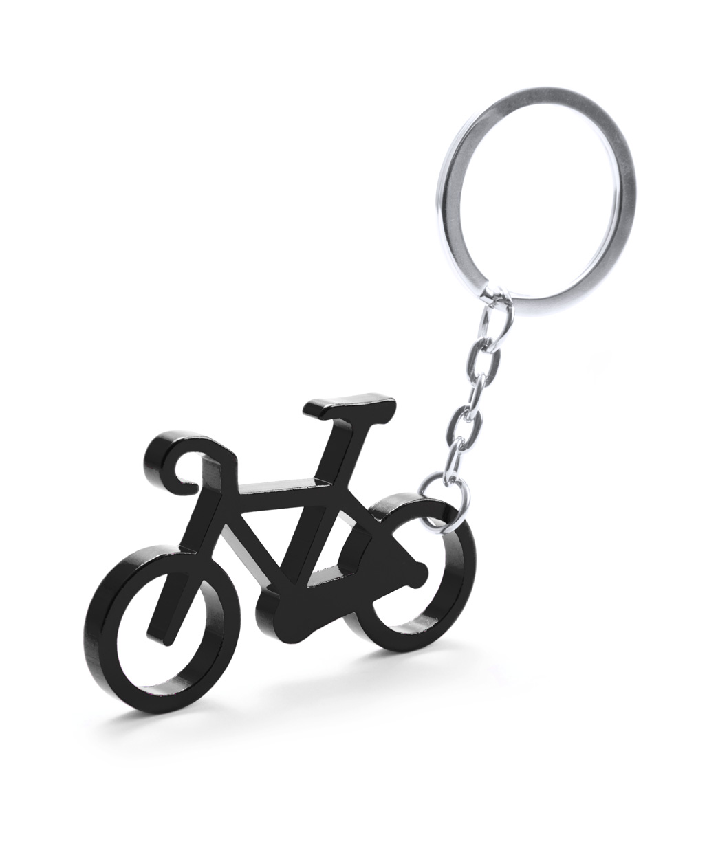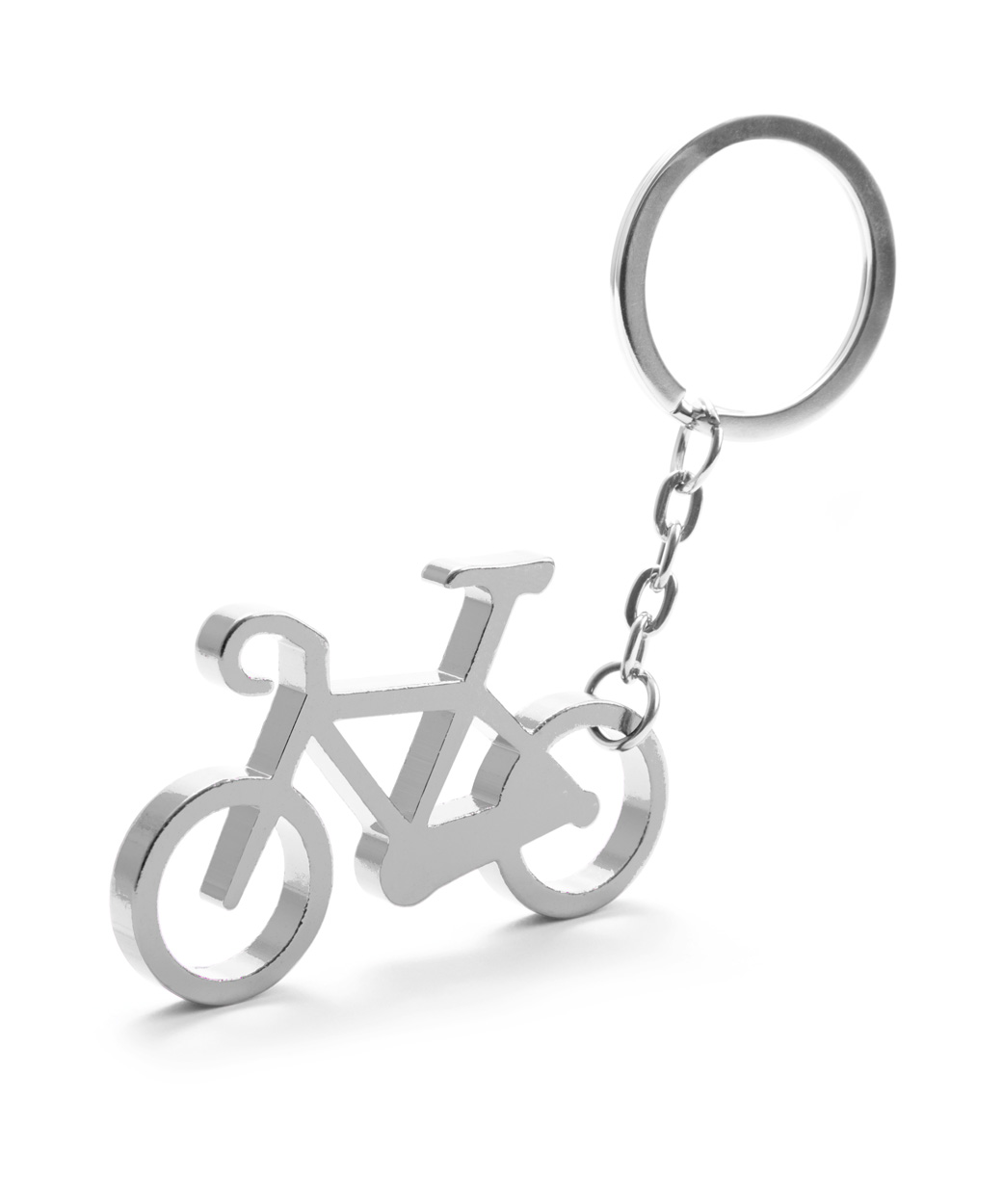 Aluminiowy brelok w kształcie roweru z otwieraczem do butelek.