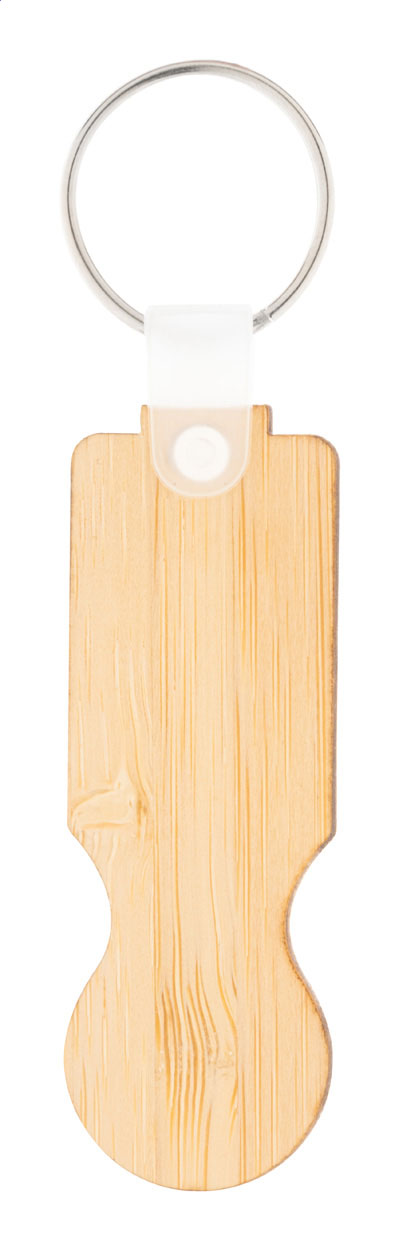 Brelok wykonany ze sklejki bambusowej z żetonem do wózka sklepowego.