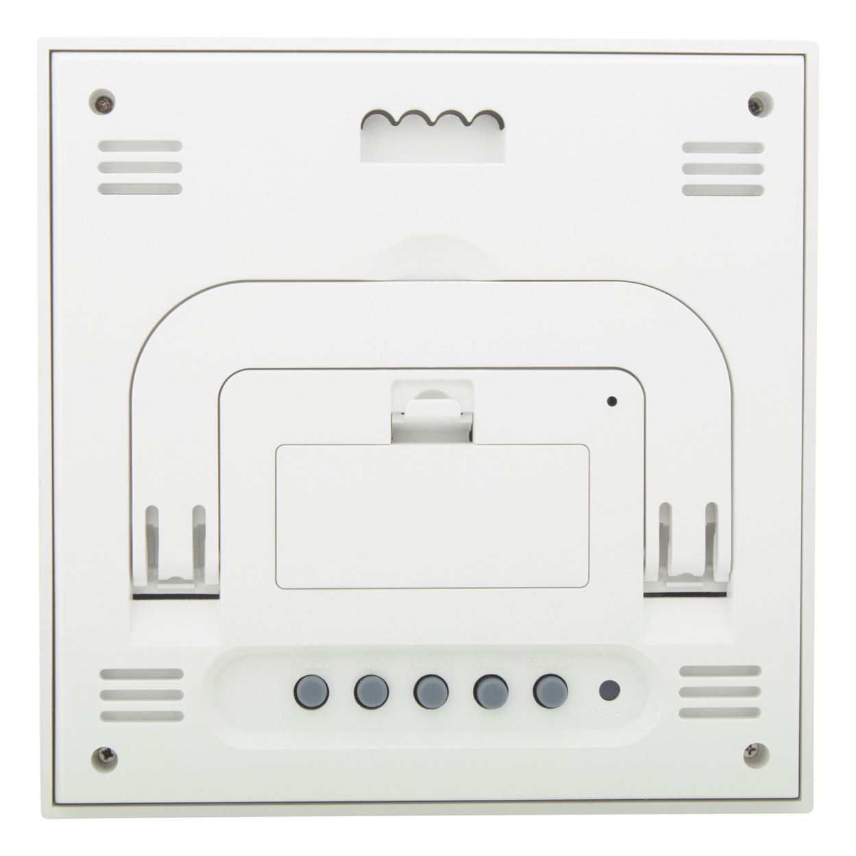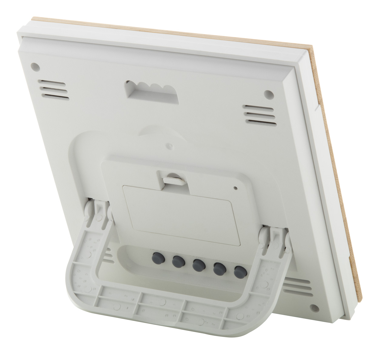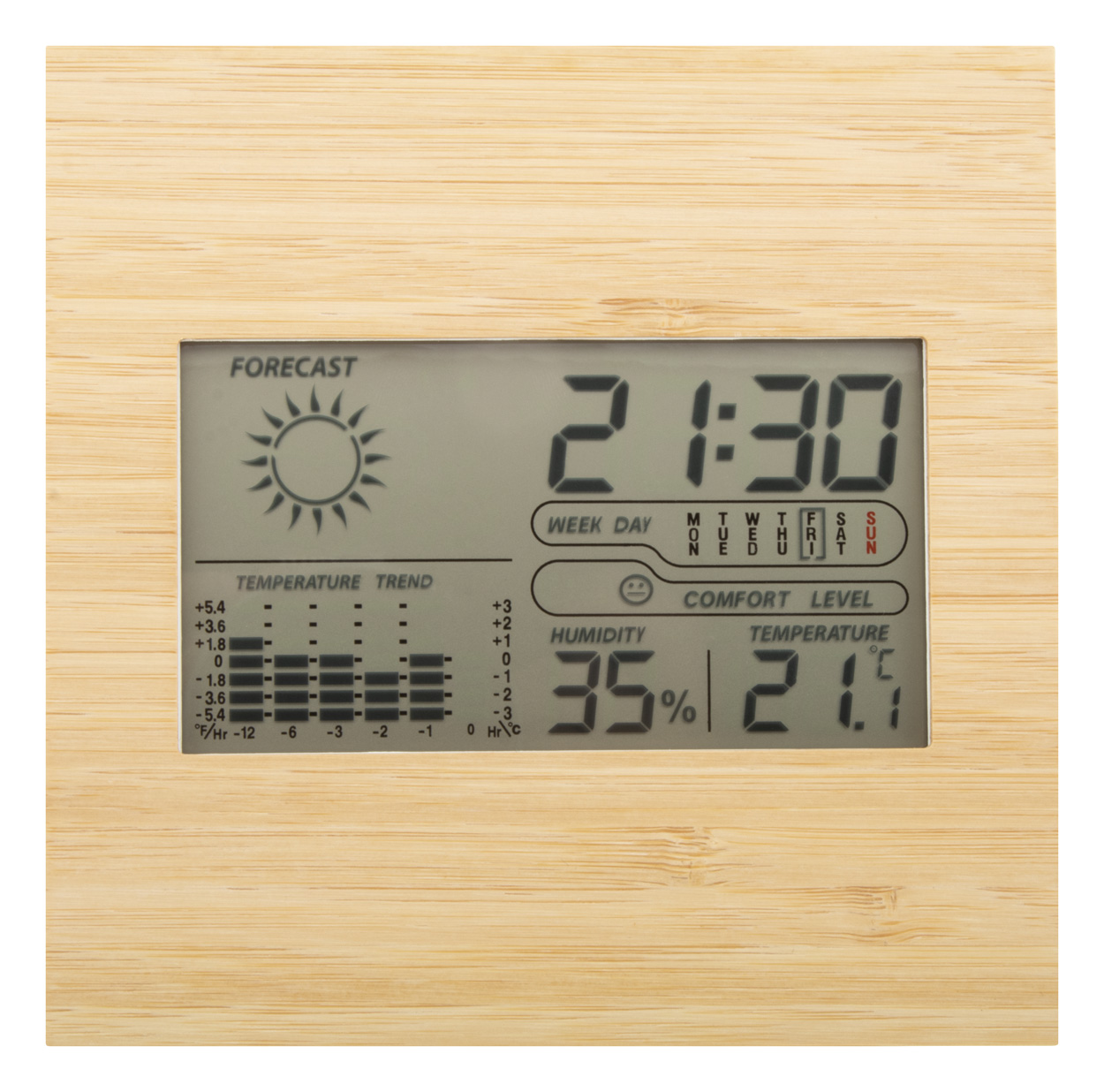 Stacja pogodowa i zegar cyfrowy z bambusowym panelem przednim. Funkcje: budzik, kalendarz, termometr, wskaźnik wilgotności i pamięć trendów temperatury. Działa na 2 baterie AAA, bez baterii.