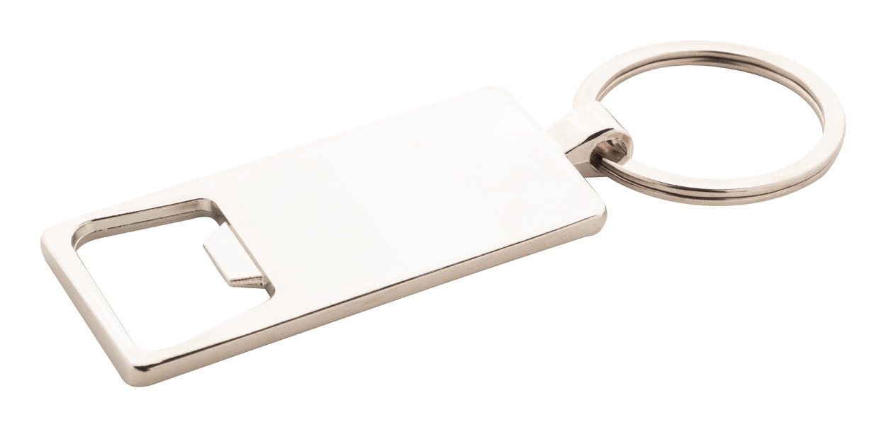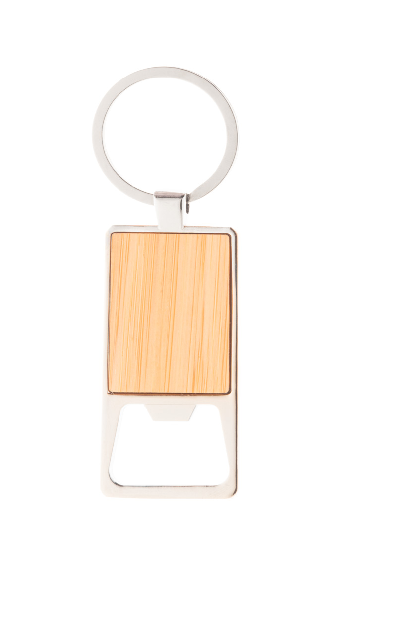 Metalowy brelok z bambusową wkładką i otwieraczem do butelek.