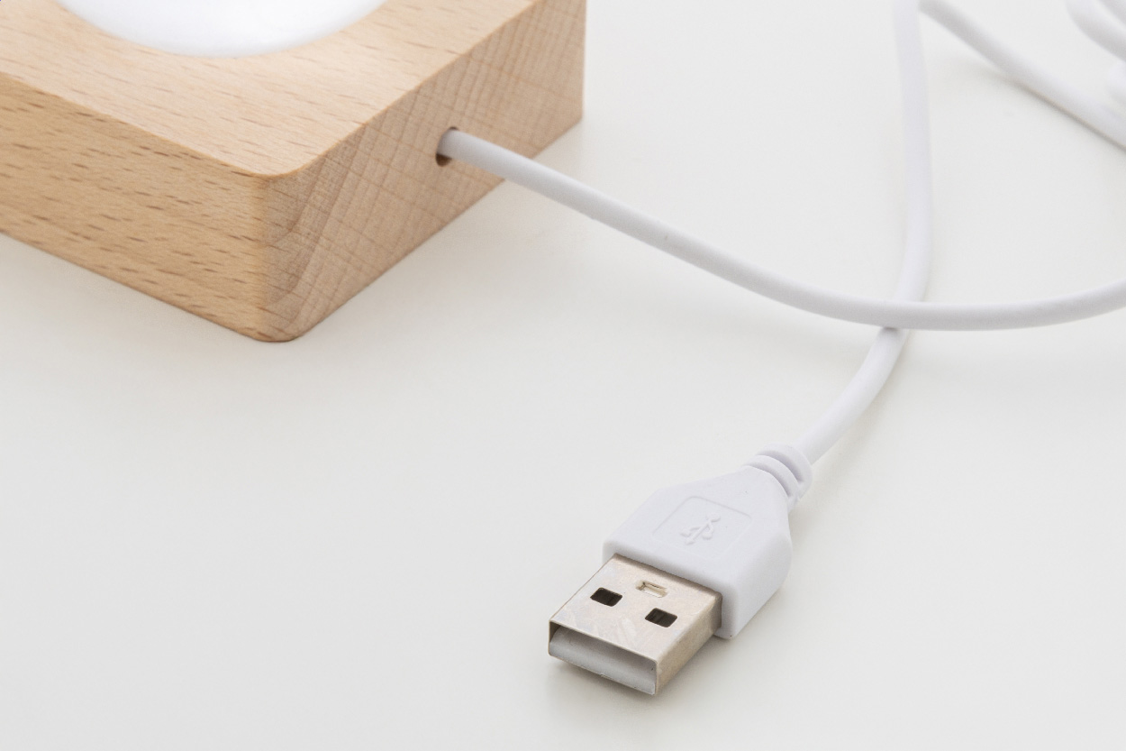 Szklana kula świąteczna z drewnianą podstawą LED. W zestawie kabel USB do ładowania.