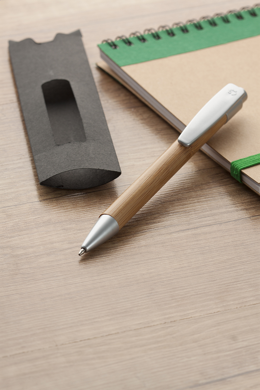 Bambusowy długopis w czarnym etui. Z niebieskim wkładem.