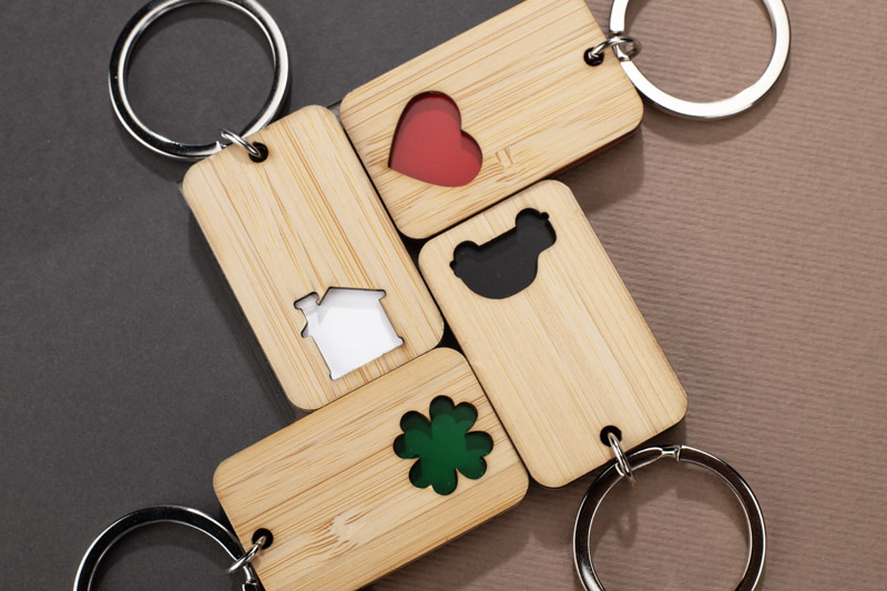 CARVE to bambusowy brelok z precyzyjnie wyciętym, kolorowym motywem (dom, samochód, serce lub koniczyna) – każdy kolor odpowiada innemu symbolowi. Estetyczny i trwały, doskonale sprawdzi się jako gadżet reklamowy z miejscem na znakowanie.