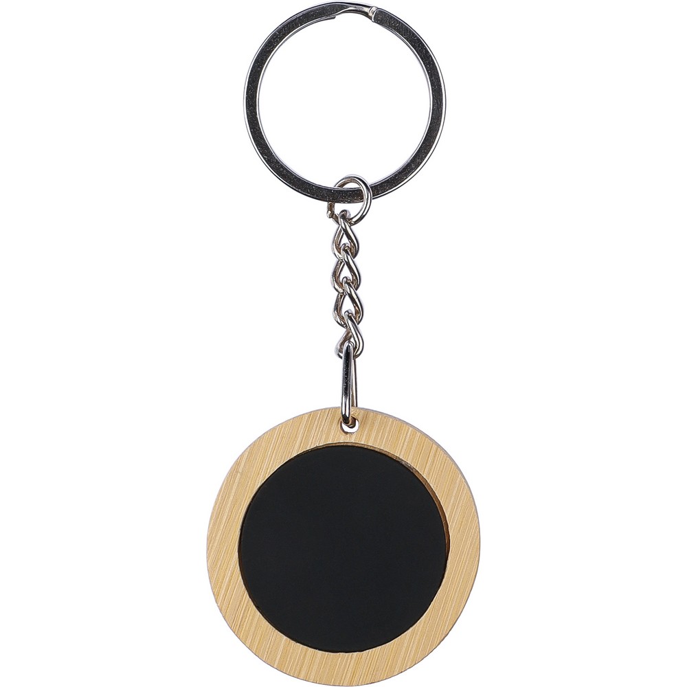 Brelok do kluczy z czarną gumowaną płytką do grawerowania, po wygrawerowaniu logo będzie widoczne w błyszczącym chromie, zapakowany w brązową kopertę kartonową, produkt wykonany ze stali nierdzewnej i bambusa