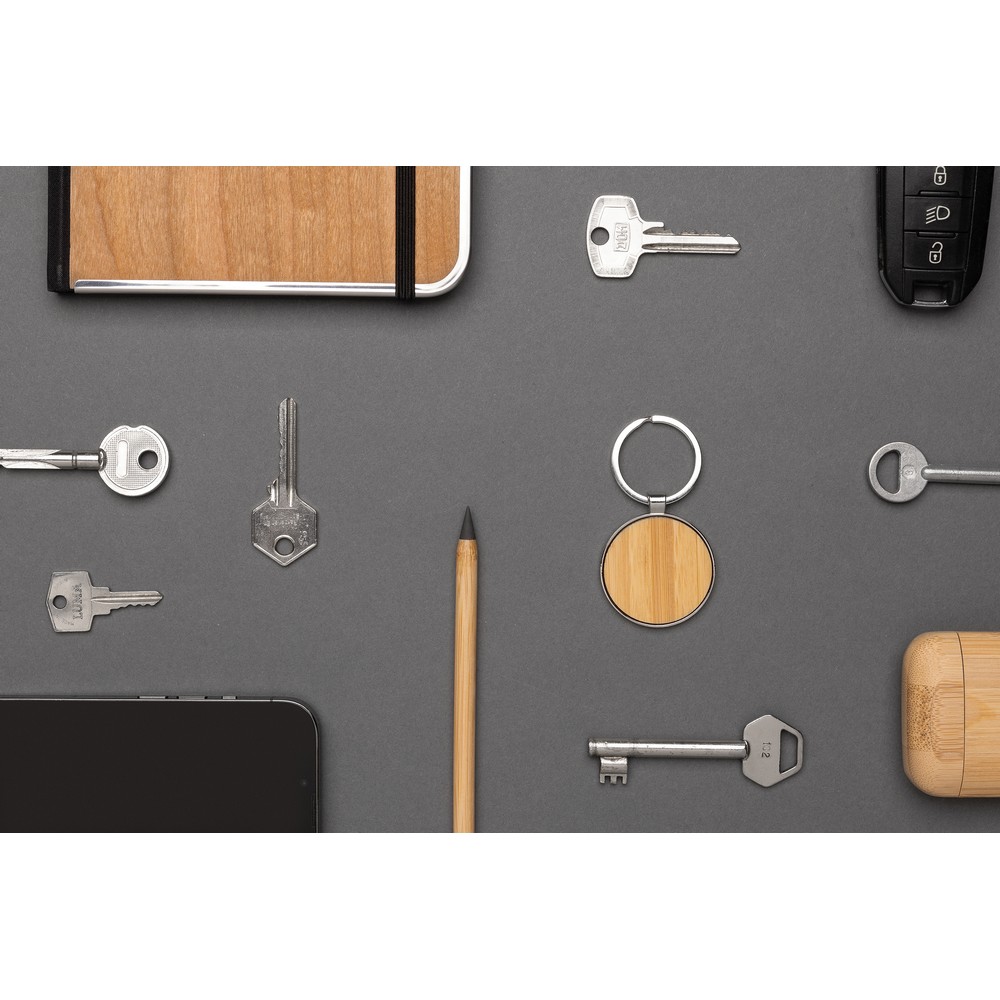 Brelok do kluczy, wykonany z metalu z recyklingu i bambusa, całkowita zawartość materiałów z recyklingu obliczona w oparciu o wagę całkowitą przedmiotu: 73%