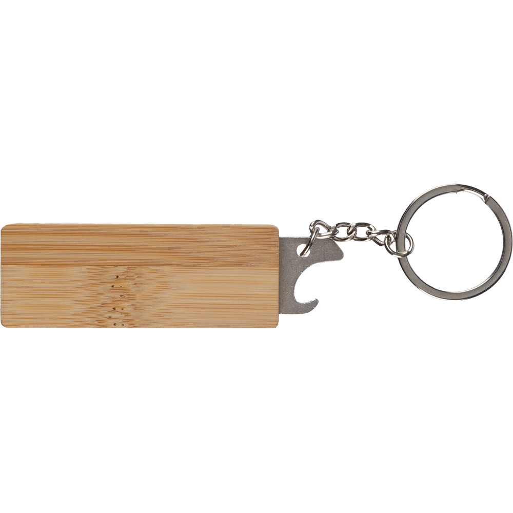 Brelok do kluczy, otwieracz do butelek, dodatkowo posiada 4 klucze płaskie, może przydać się podczas plenerowych wypadów, zapakowany w kartonik, produkt wykonany z bambusa