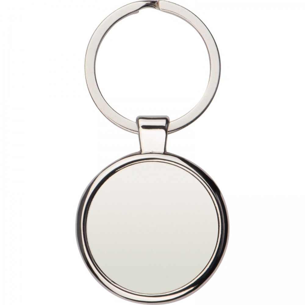 Okrągły brelok z chromowanego metalu.