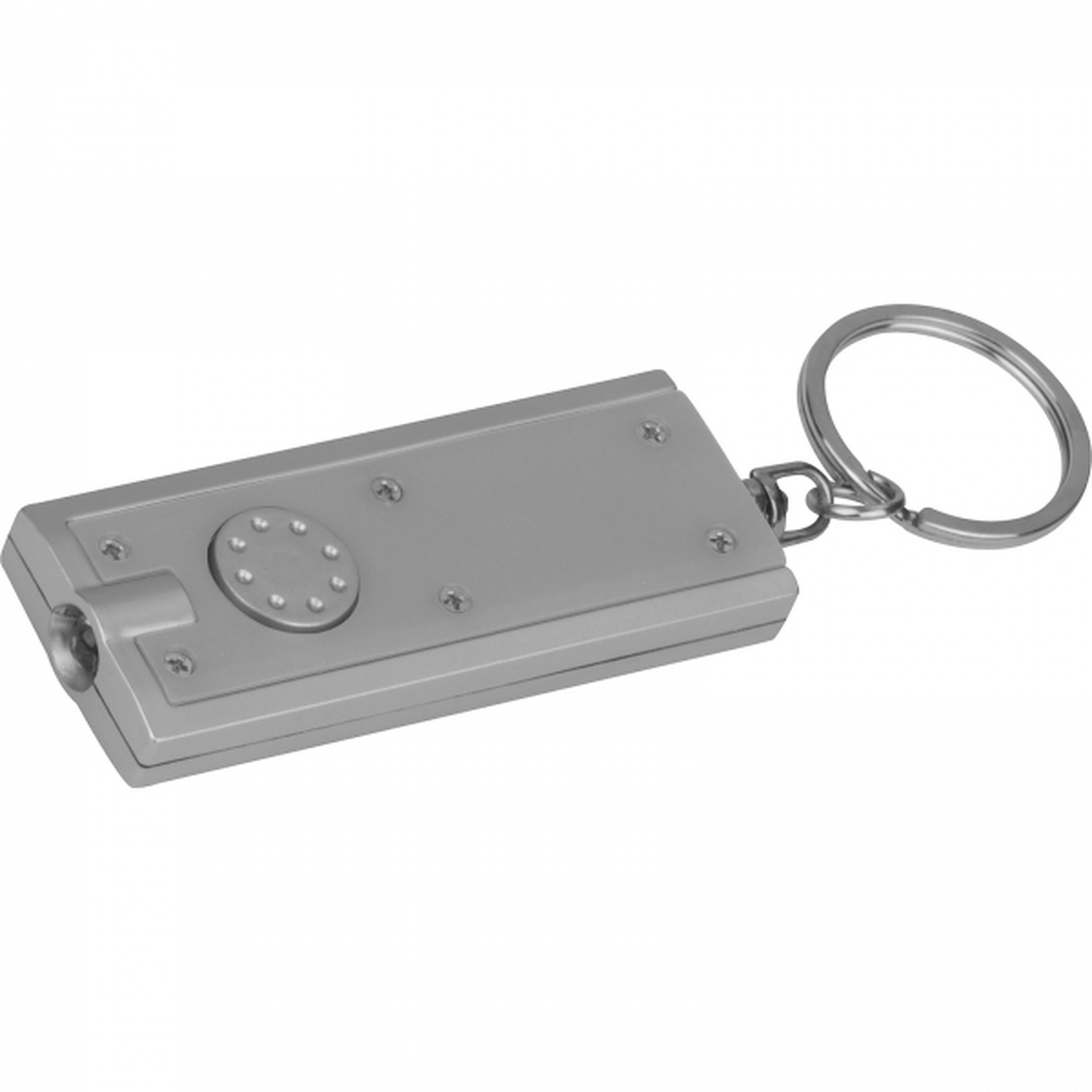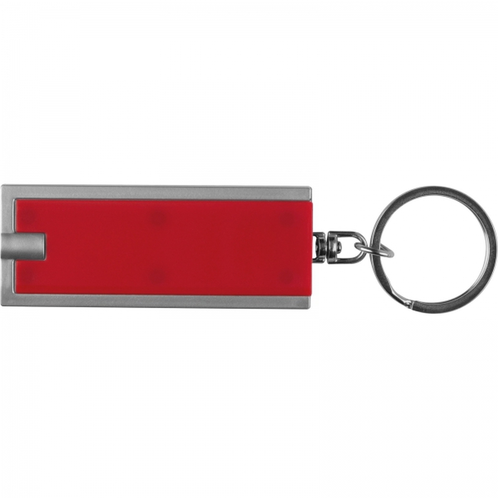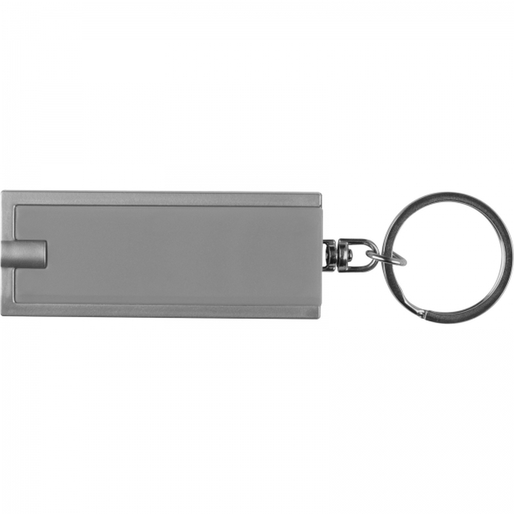 Płaski, plastikowy brelok z wbudowaną latarką LED o białym świetle, na metalowym kółku. Produkt zawiera baterie.