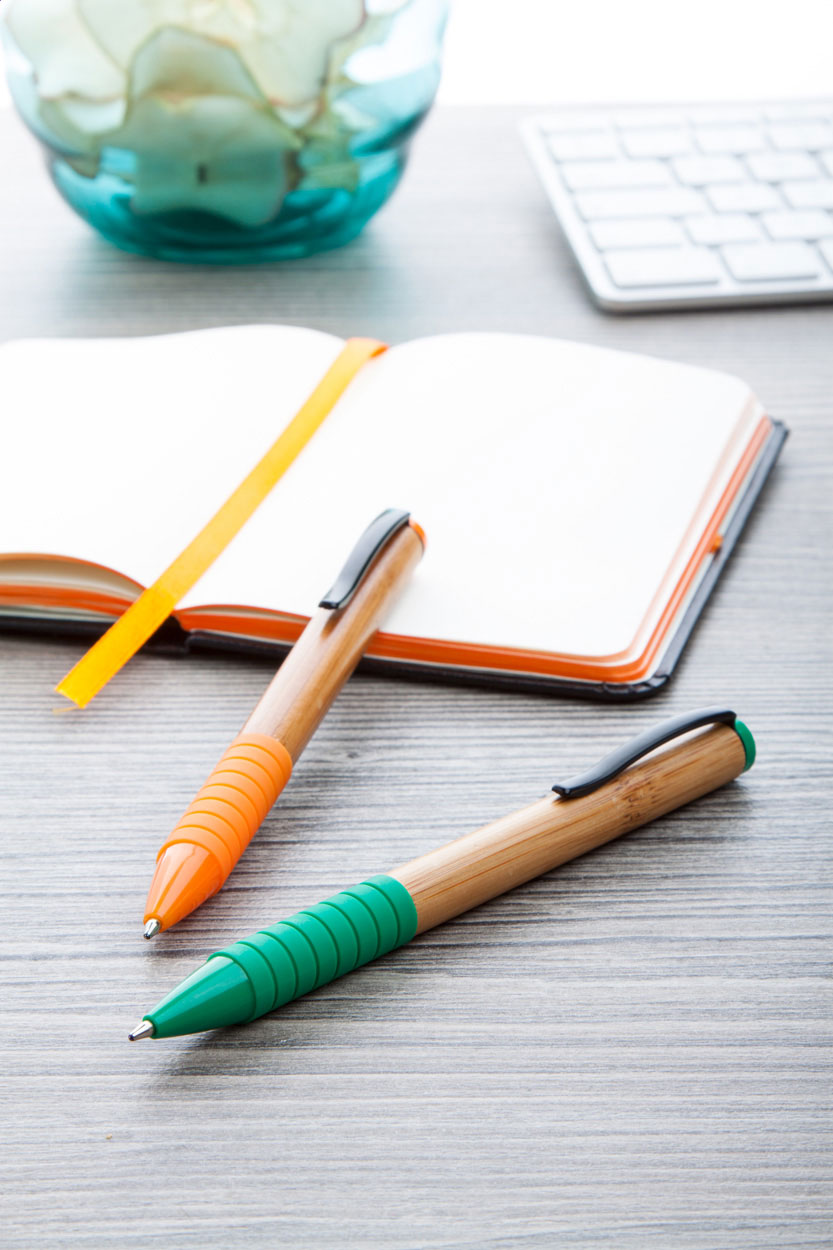 Bambusowy, przekręcany długopis z metalowym klipem, kolorowymi końcami i gumowym uchwytem tego samego koloru. Z niebieskim wkładem.