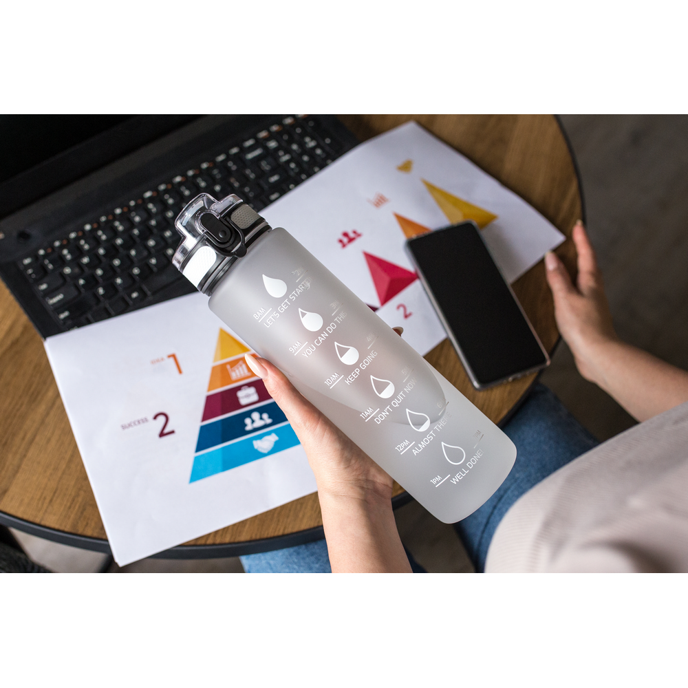 Butelka motywacyjna 1000 ml, skala ml z jednej strony i podziałka motywacyjna z drugiej strony, zamknięcie z blokadą, pasek na rękę (pakowany oddzielnie), gumowane wykończenie, przeznaczona wyłącznie do zimnych i niegazowanych napojów