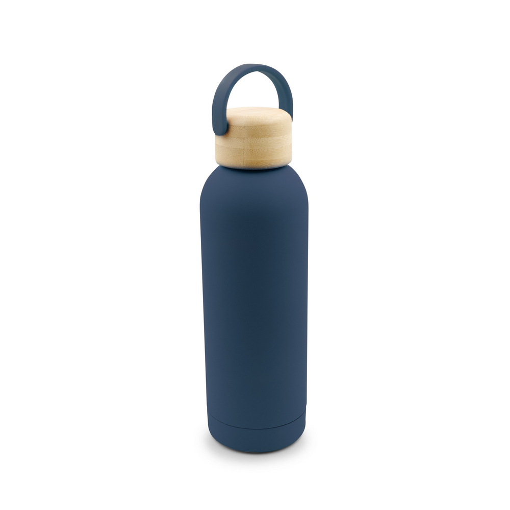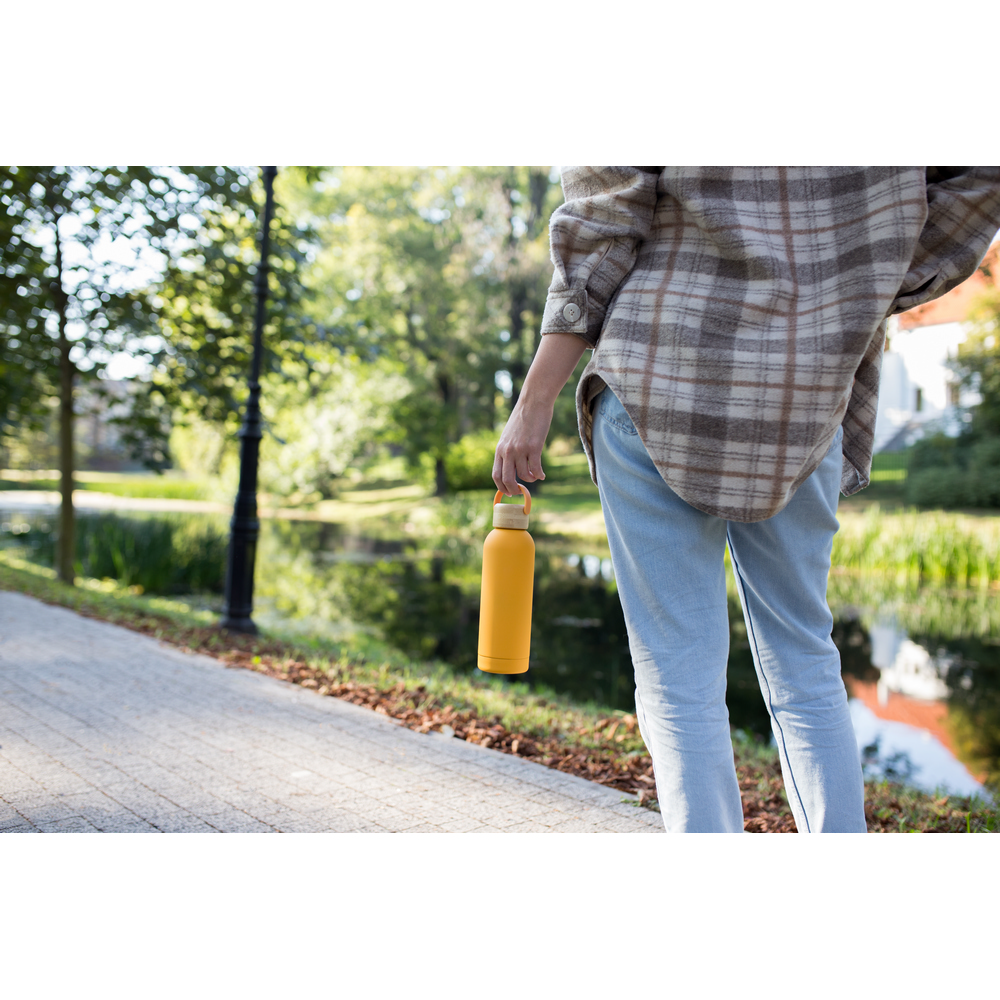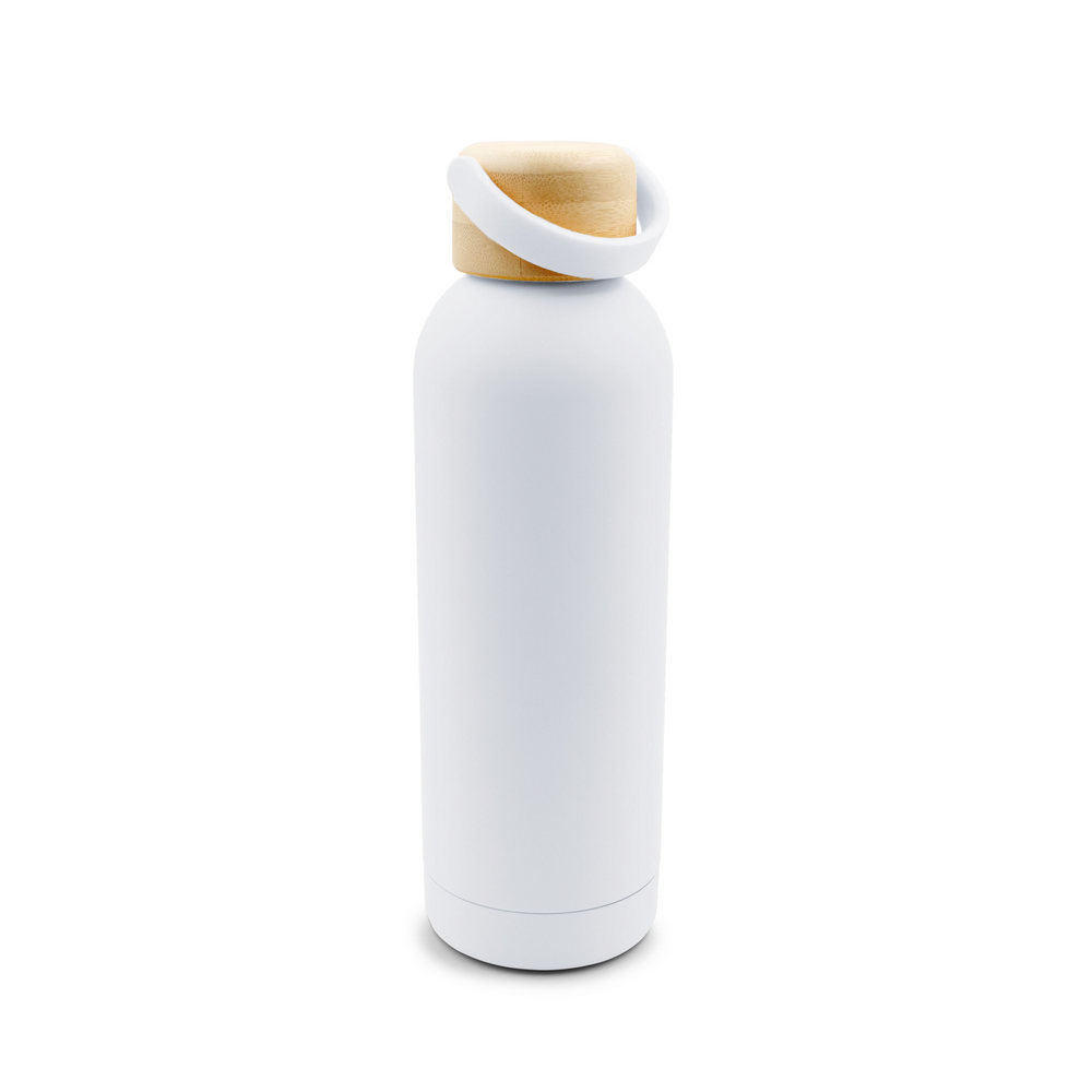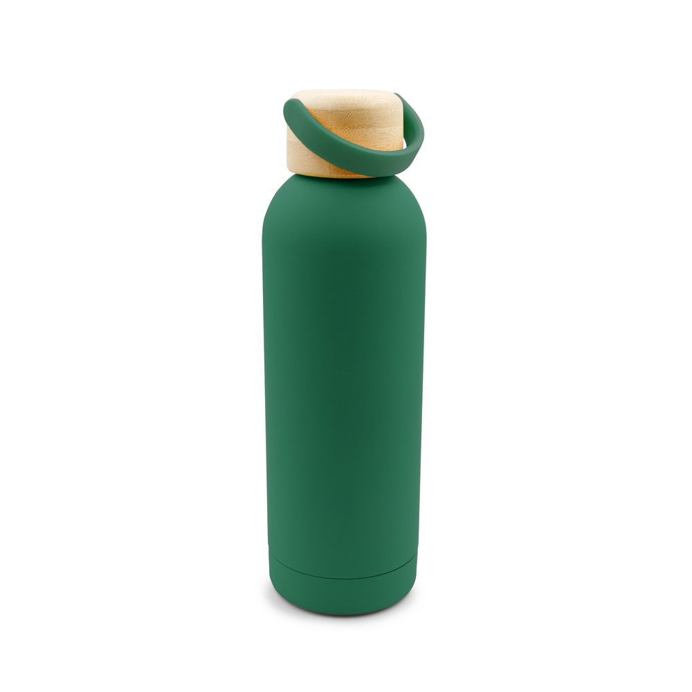 Butelka termiczna 500 ml, posiada podwójne ścianki ze stali nierdzewnej z próżnią między ściankami, co spowalnia oddawanie temperatury na zewnątrz, zachowując funkcje termosu, gumowe wykończenie, bambusowa zakrętka ze składanym uchwytem wykonanym z silikonu ułatwiającym noszenie, produkt wykonany ze stali nierdzewnej, plastiku i bambusa, utrzymuje temperaturę napojów gorących do 20 godzin +leakproof