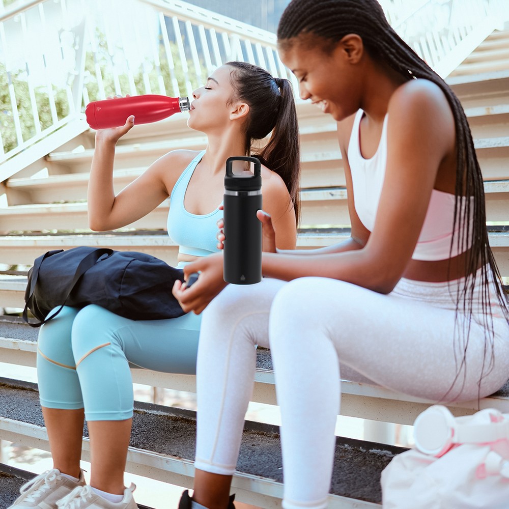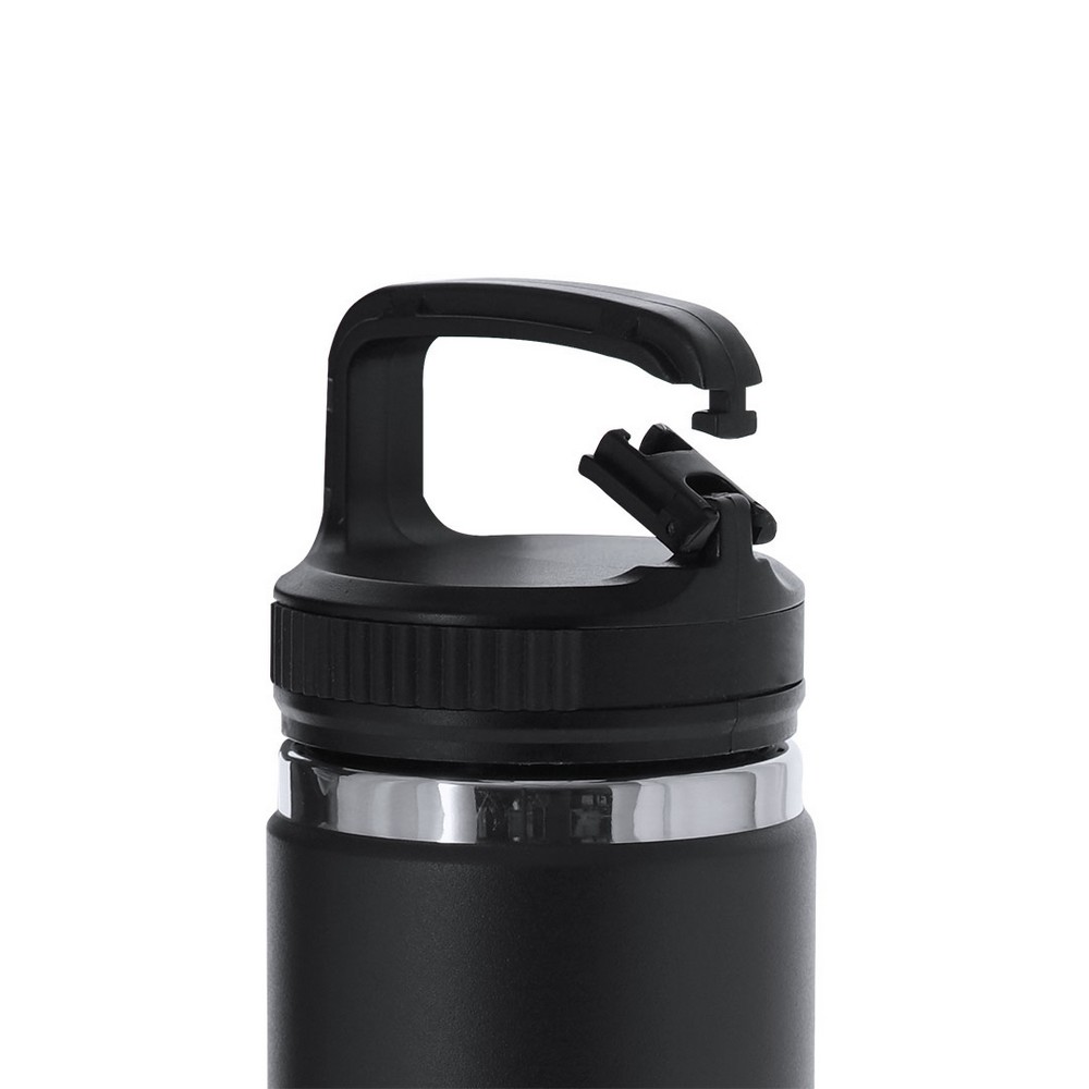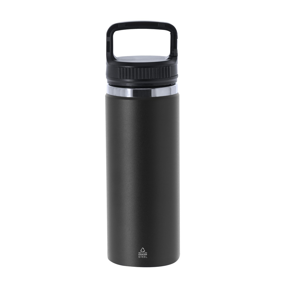 Butelka termiczna 550 ml z karabińczykiem umożliwiającym przypinanie, posiada podwójne ścianki, które spowalniają oddawanie temperatury na zewnątrz, produkt wykonany ze stali nierdzewnej z recyklingu