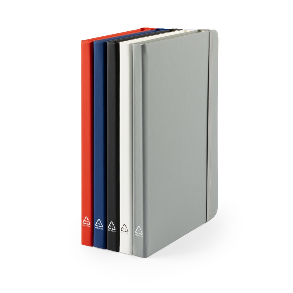 Notatnik A5 wykonany z poliuretanu (35%) i poliuretanu (15%) pochodzącego z recyklingu. Twarda okładka wykonana jest w 100% z kartonu pochodzącego z recyklingu. Zawiera 192 kartki w linie, w 100% z recyklingu, w kolorze kości słoniowej, pasek rozdzielający i gumkę do zamykania notatnika