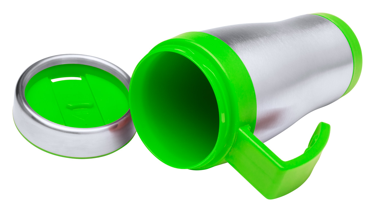 Kubek termiczny ze stali nierdzewnej z podwójną ścianką i kolorowymi akcentami i rączką, w pudełku. Poj. 450 ml.