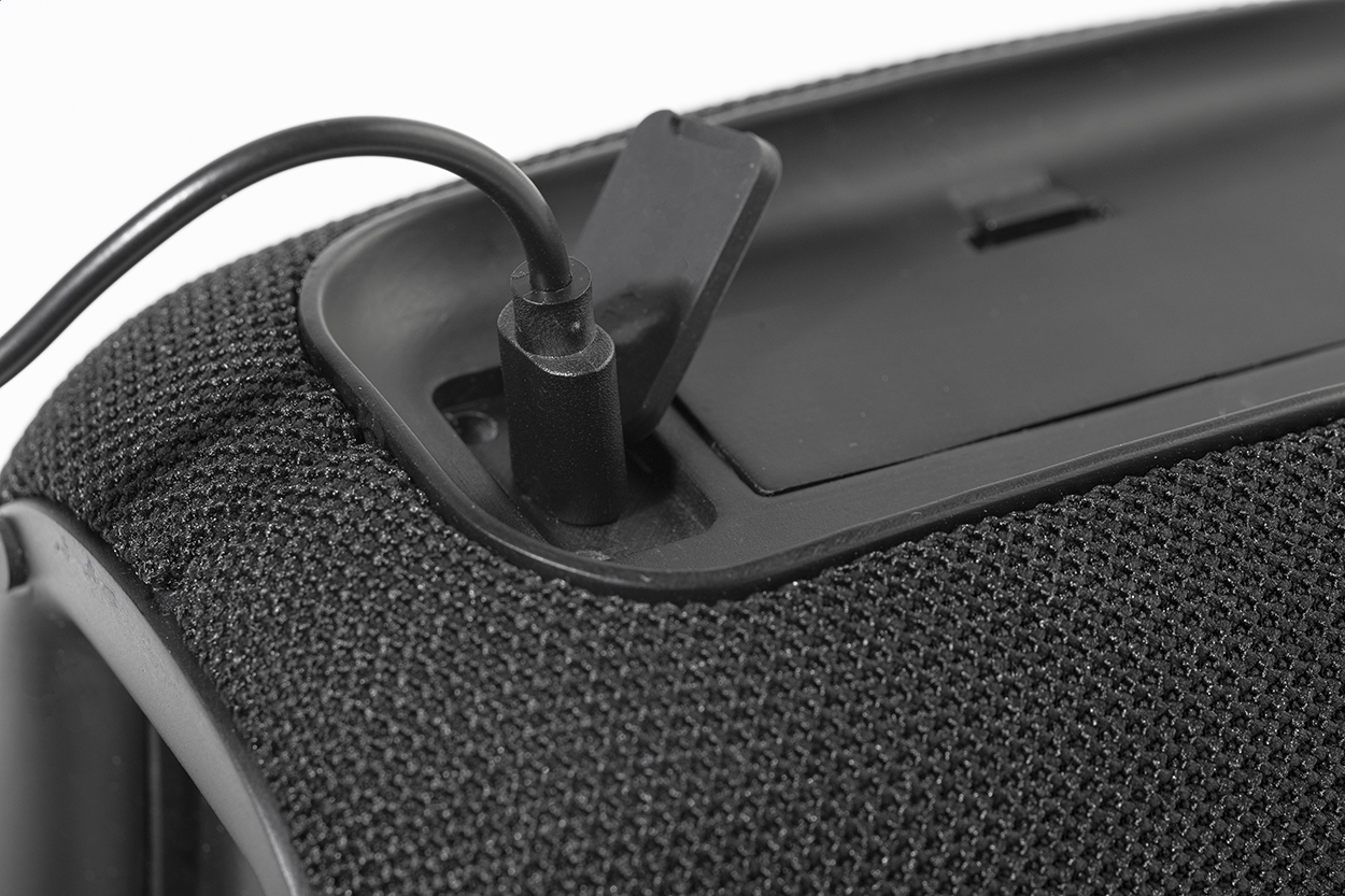 Głośnik bezprzewodowy z recyklingowanego ABS, z siatką poliestrową RPET, aluminiowym karabińczykiem i metalową płytką z logo. Z wbudowanym akumulatorem (1800 mAh). W zestawie kabel USB do ładowania.