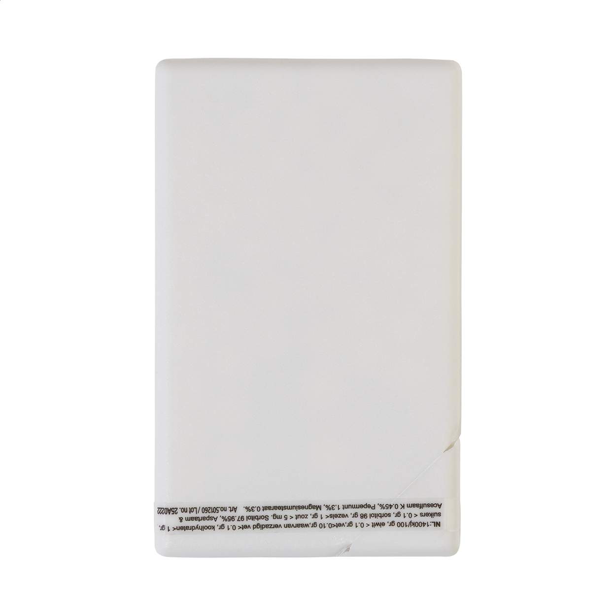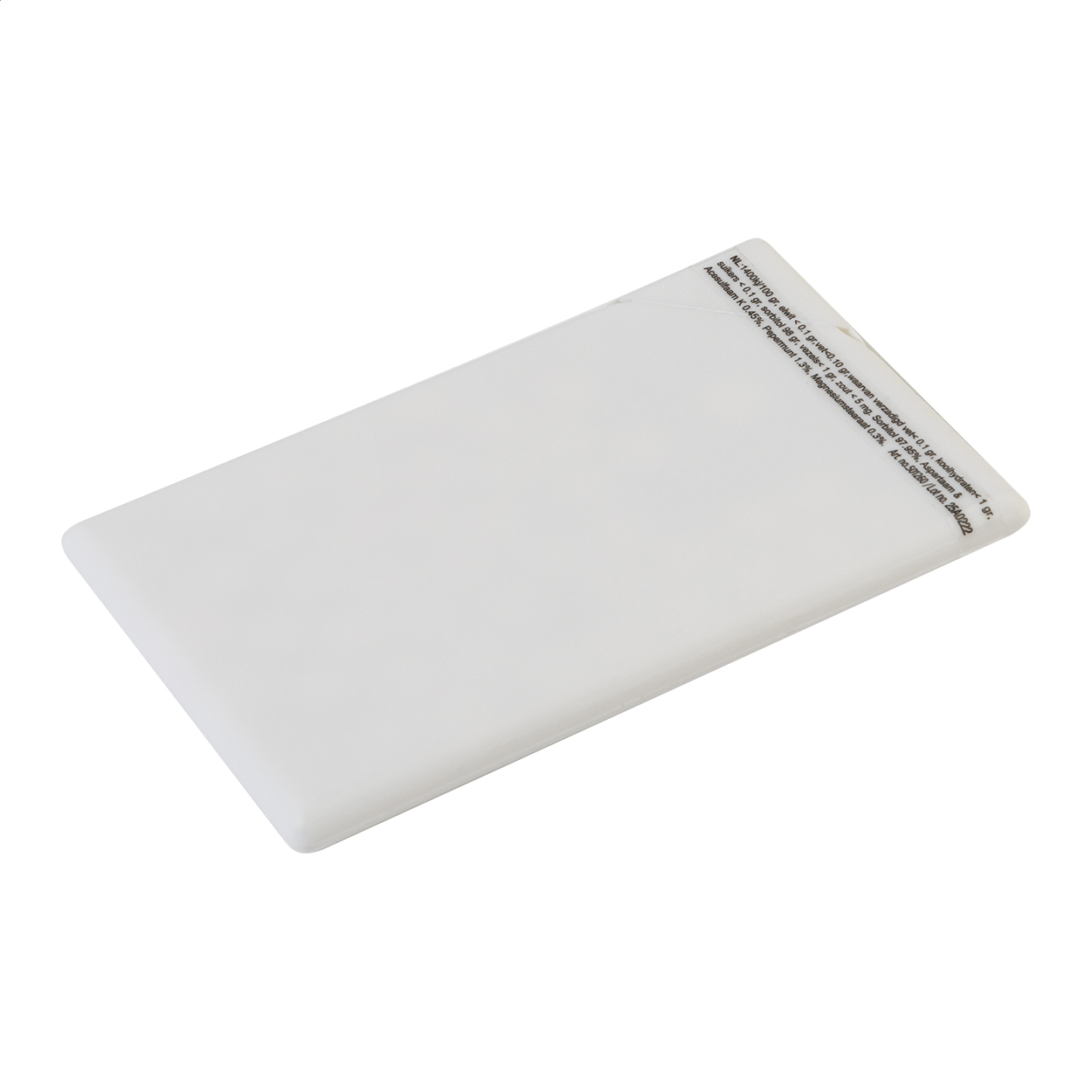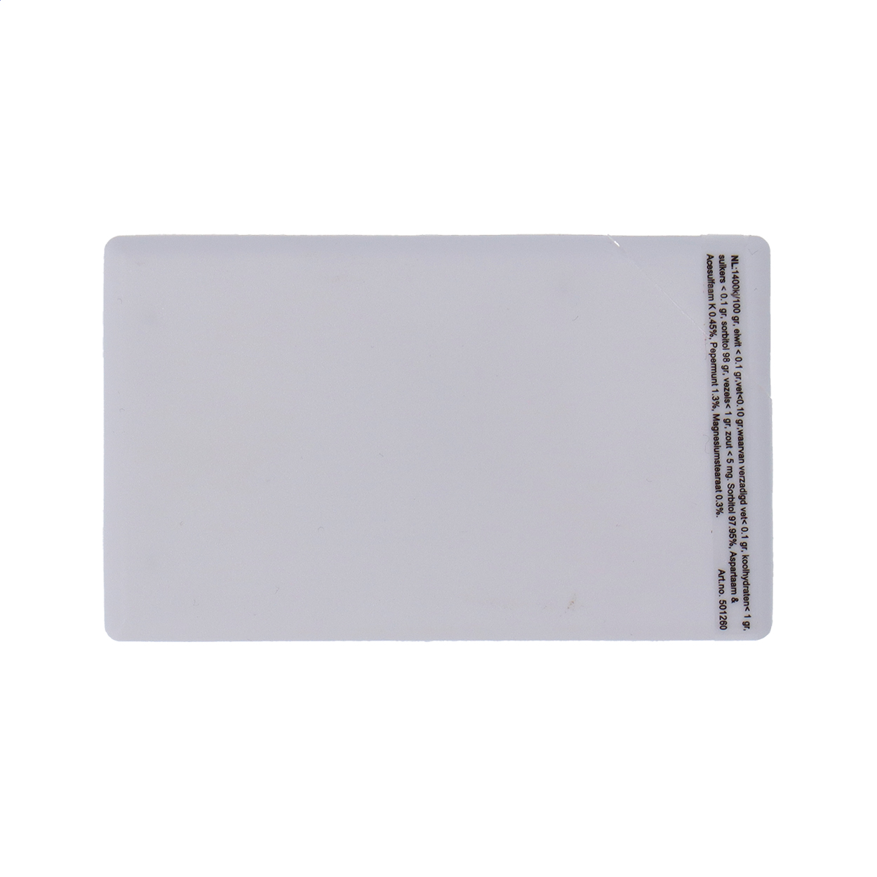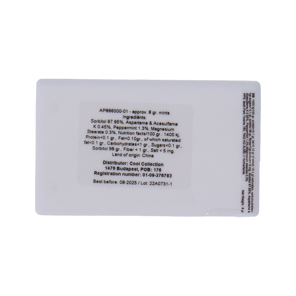 Plastikowe pudełko miętówek w kształcie karty, zawierające ok. 8 g cukierków mentolowych.