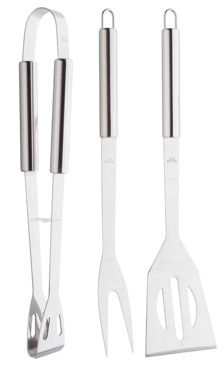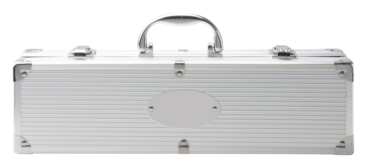 3-częściowy zestaw do grillowania ze stali nierdzewnej (widelec, łopatka i klips) w aluminiowej walizce.