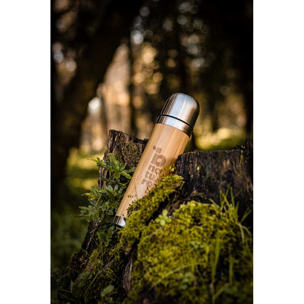 Termos o podwójnych ściankach z izolacją próżniową z bambusa i stali nierdzewnej. Butelka ma pojemność do 450 mL i utrzymuje napoje gorące przez 12 godziny i zimne przez 24 godzin. Dostarczany w pudełku upominkowym z papieru kraft. Ponieważ produkt jest wykonany z naturalnych materiałów, kolor produktu oraz wynik drukowania mogą się różnić w zależności od produktu