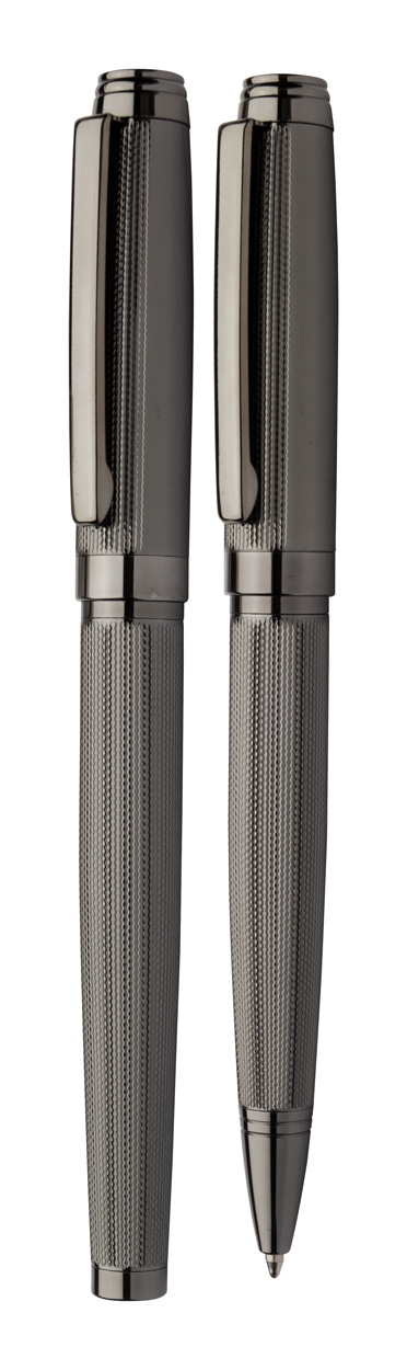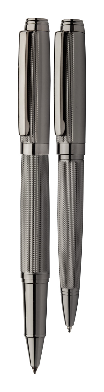 Elegancki, metalowy zestaw składający się z długopisu i pióra kulkowego z wzorami na korpusach. W czarnym pudełku upominkowym, z niebieskim wkładem. Produkt marki André Philippe.