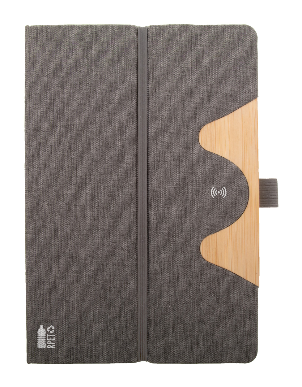 Notes z okładką z poliestru RPET, z wkładką bambusową, funkcją uchwytu na telefon i wbudowaną szybką ładowarką indukcyjną (15W). Zawiera 80 kartek w linie z papieru makulaturowego. Rozmiar A5. W zestawie kabel do ładowarki USB.