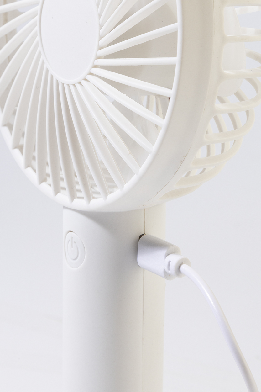 Elektryczny wentylator ręczny z recyklingowanego polipropylenu z uchwytem na telefon komórkowy i wbudowanym akumulatorem USB (800 mAh). Z 3 ustawieniami prędkości. W zestawie kabel USB do ładowania.