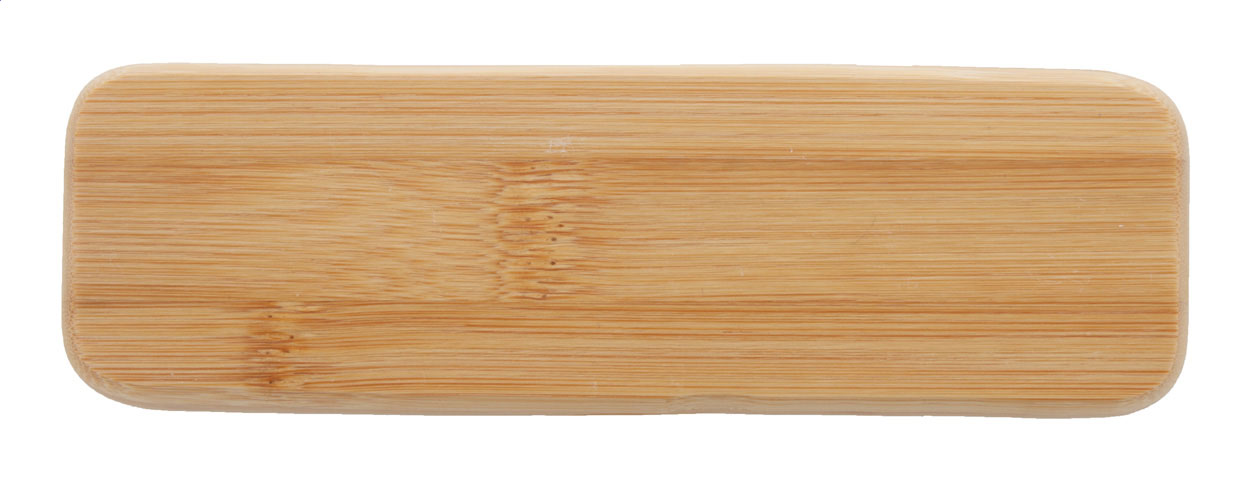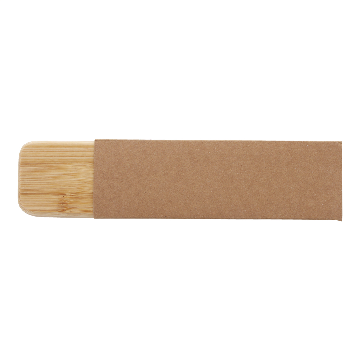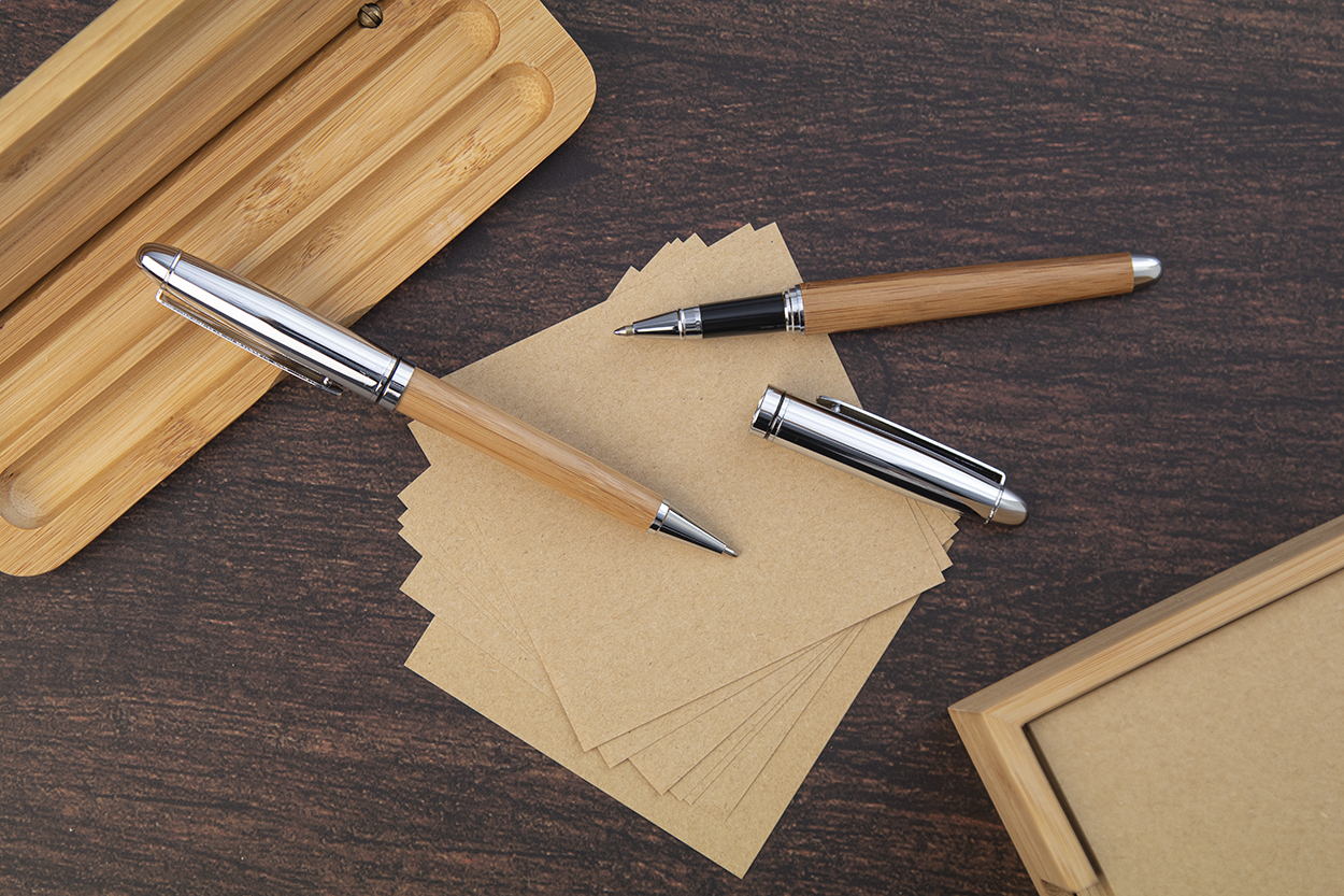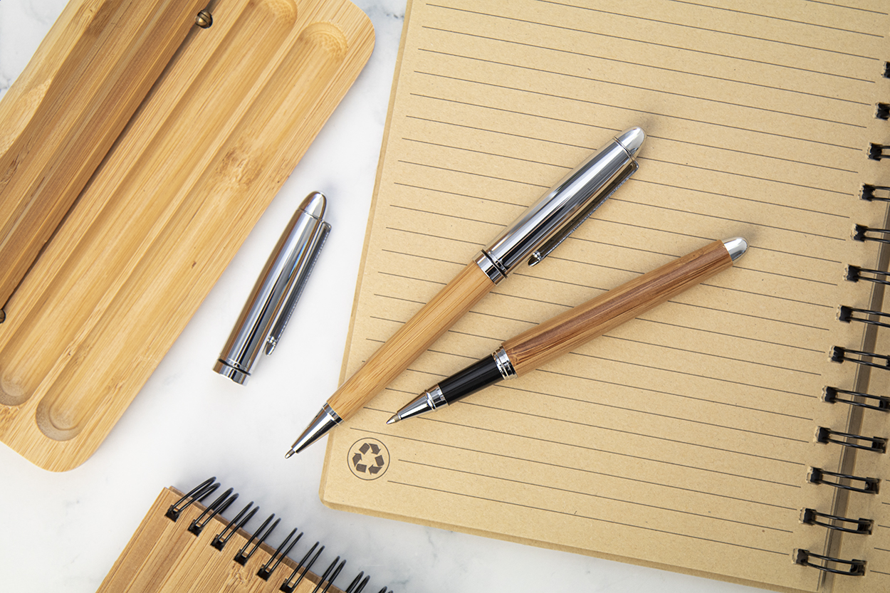 Elegancki, bambusowo-metalowy zestaw składający się z długopisu i pióra kulkowego w bambusowym etui. Z niebieskim wkładem.