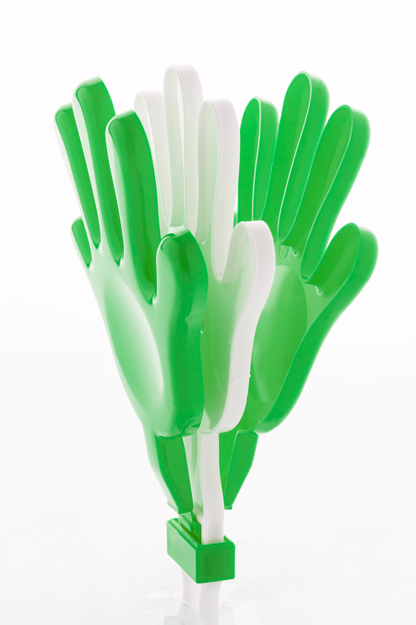 Klaskacz w kształcie dłoni, wykonany z przetworzonego plastiku PP.