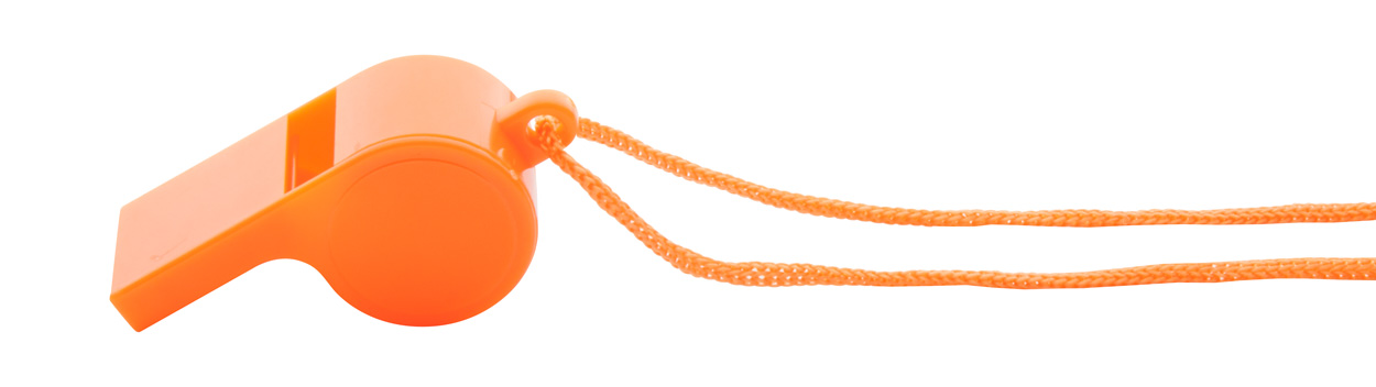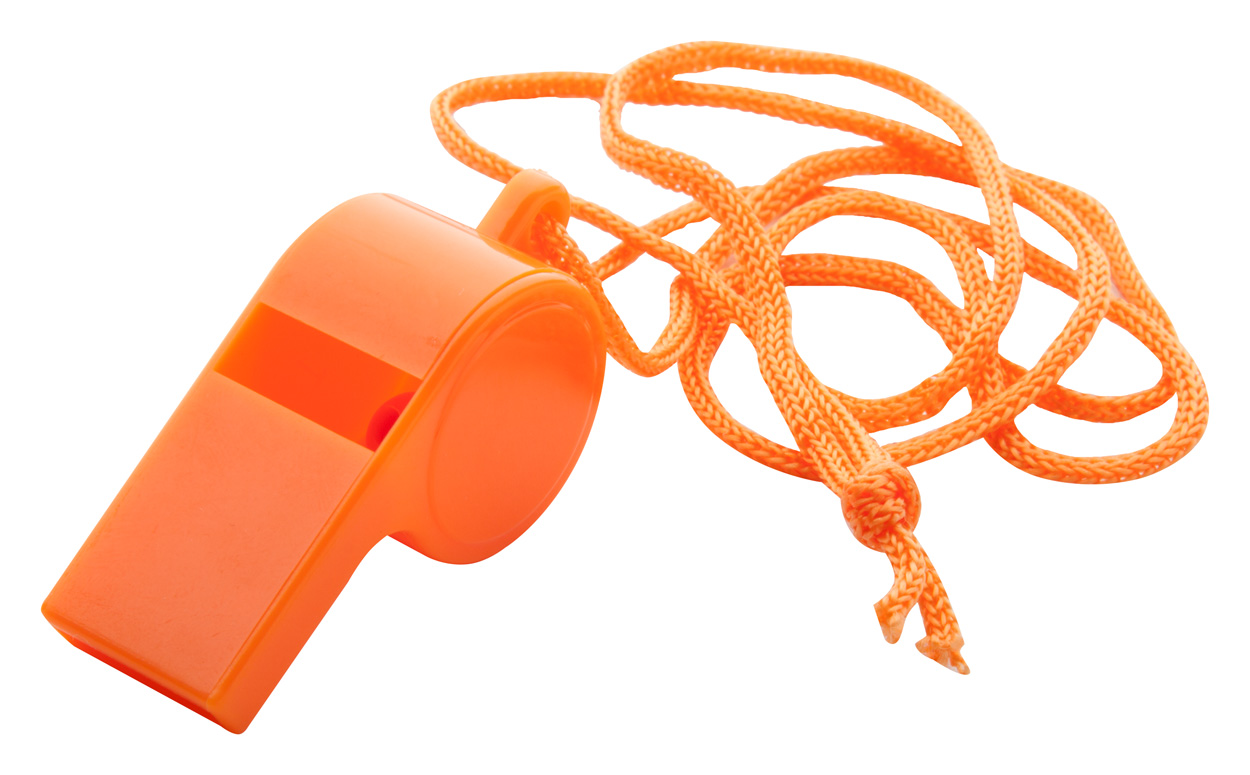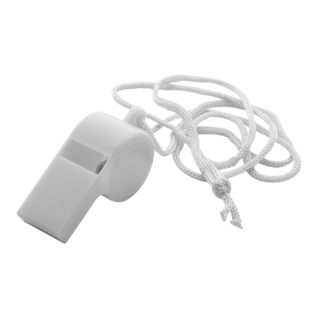Plastikowy gwizdek ze smyczą w tym samym kolorze.
