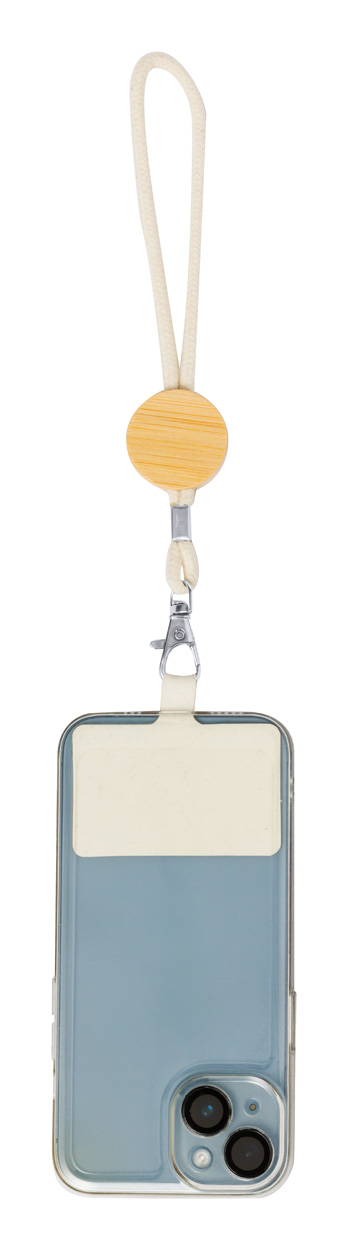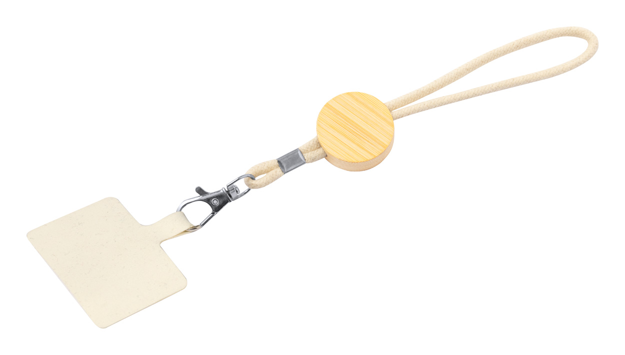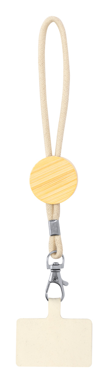 Bawełniany pasek na nadgarstek do uchwytu na telefon z okrągłą bambusową przywieszką, zawieszką na telefon i metalowym karabińczykiem.