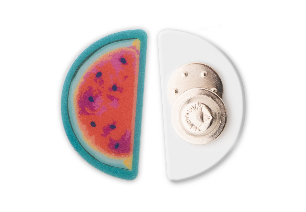 Personalizowana plakietka z magnetycznym pinem i grafiką full kolor. Produkt w dowolnym kształcie (maksymalny rozmiar 50x50mm). Cena zawiera nadruk UV LED. Min. ilość: 100szt.