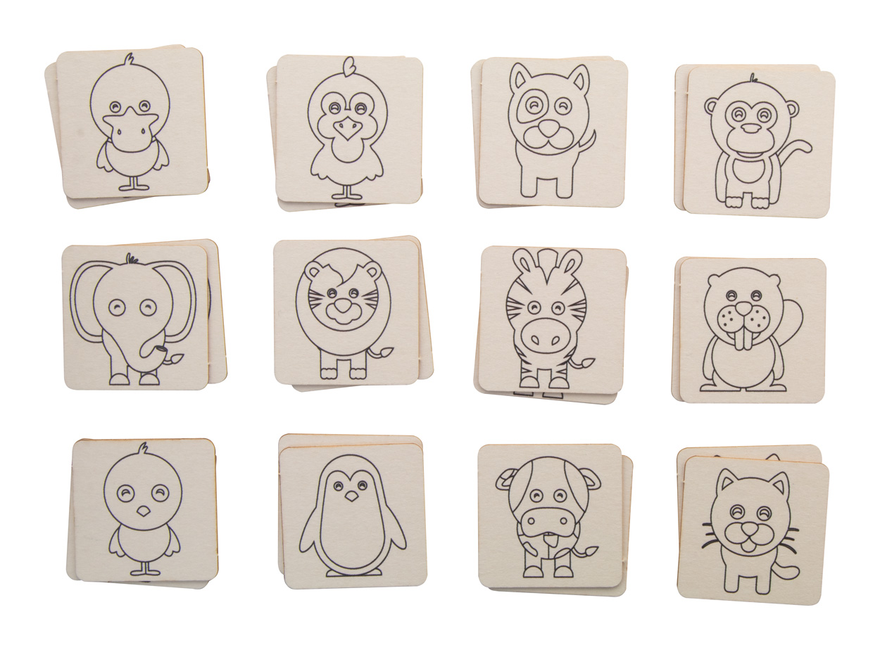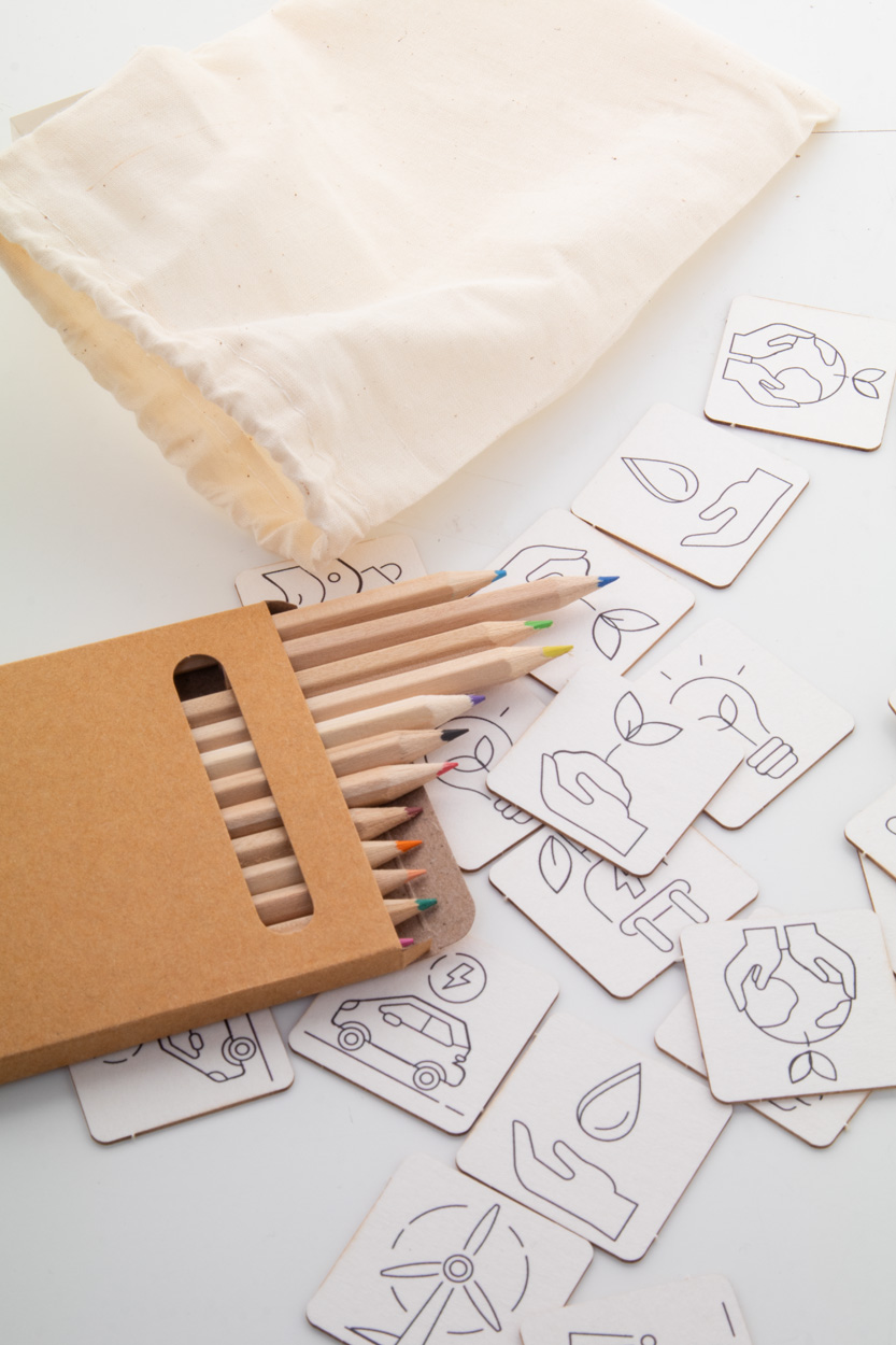 Gra memory do kolorowania w bawełnianym etui. Zawiera tematyczną tekturową grę memory (24 płytki) i drewniane kredki (12 sztuk) w papierowym pudełku.