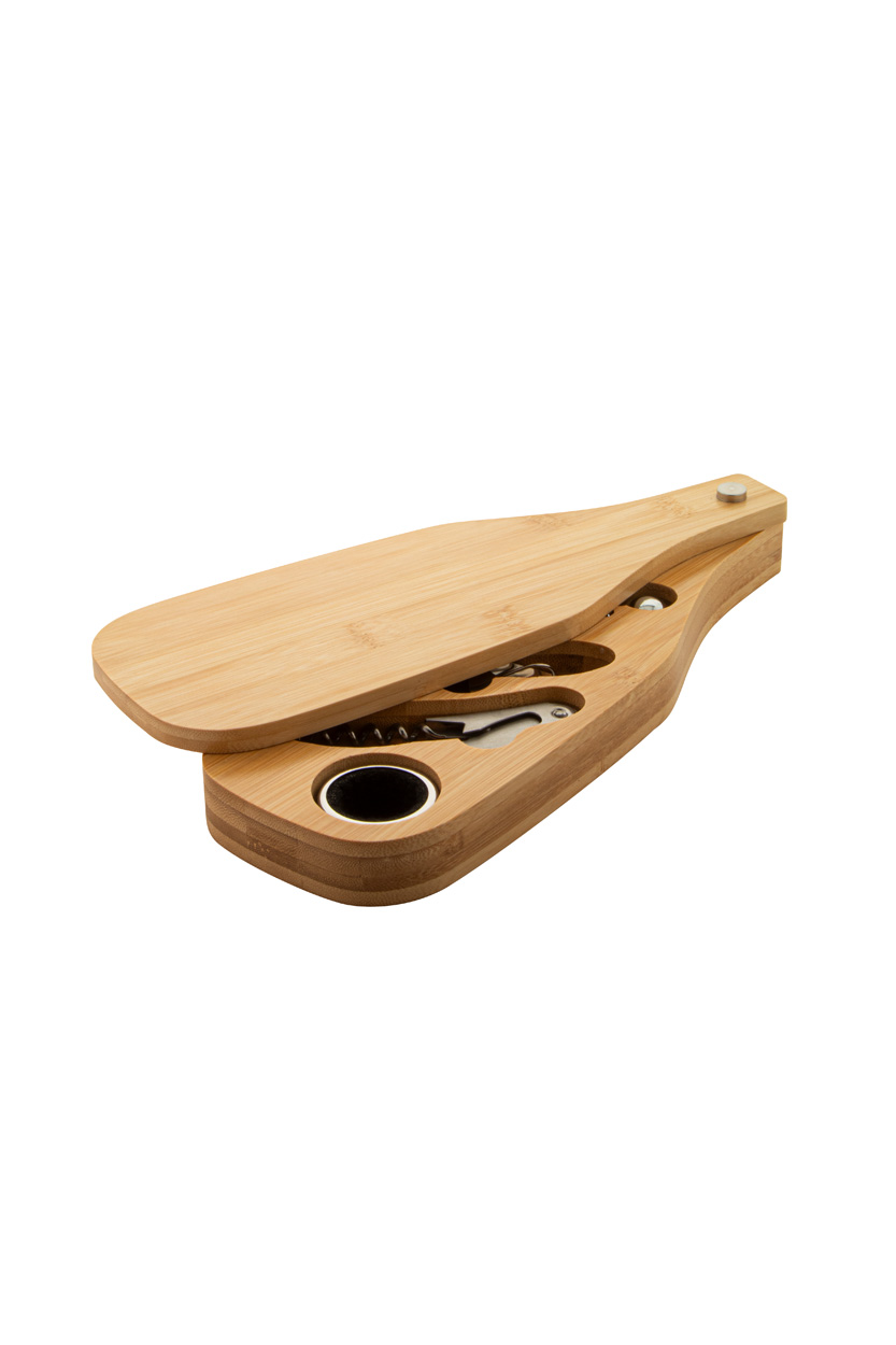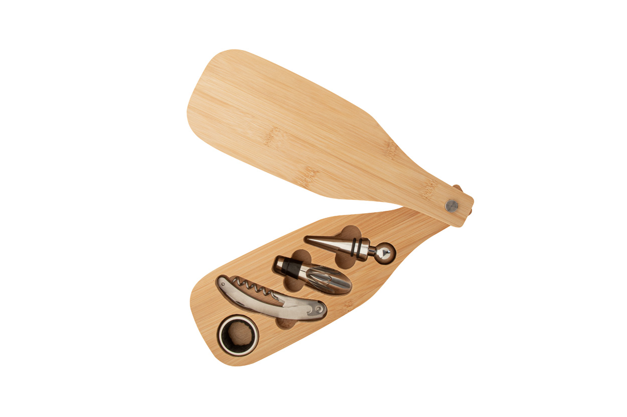 4-częściowy zestaw do wina ze stali nierdzewnej w bambusowym pudełku w kształcie butelki. Zawiera korkociąg, ociekacz, lejek i zatyczkę.