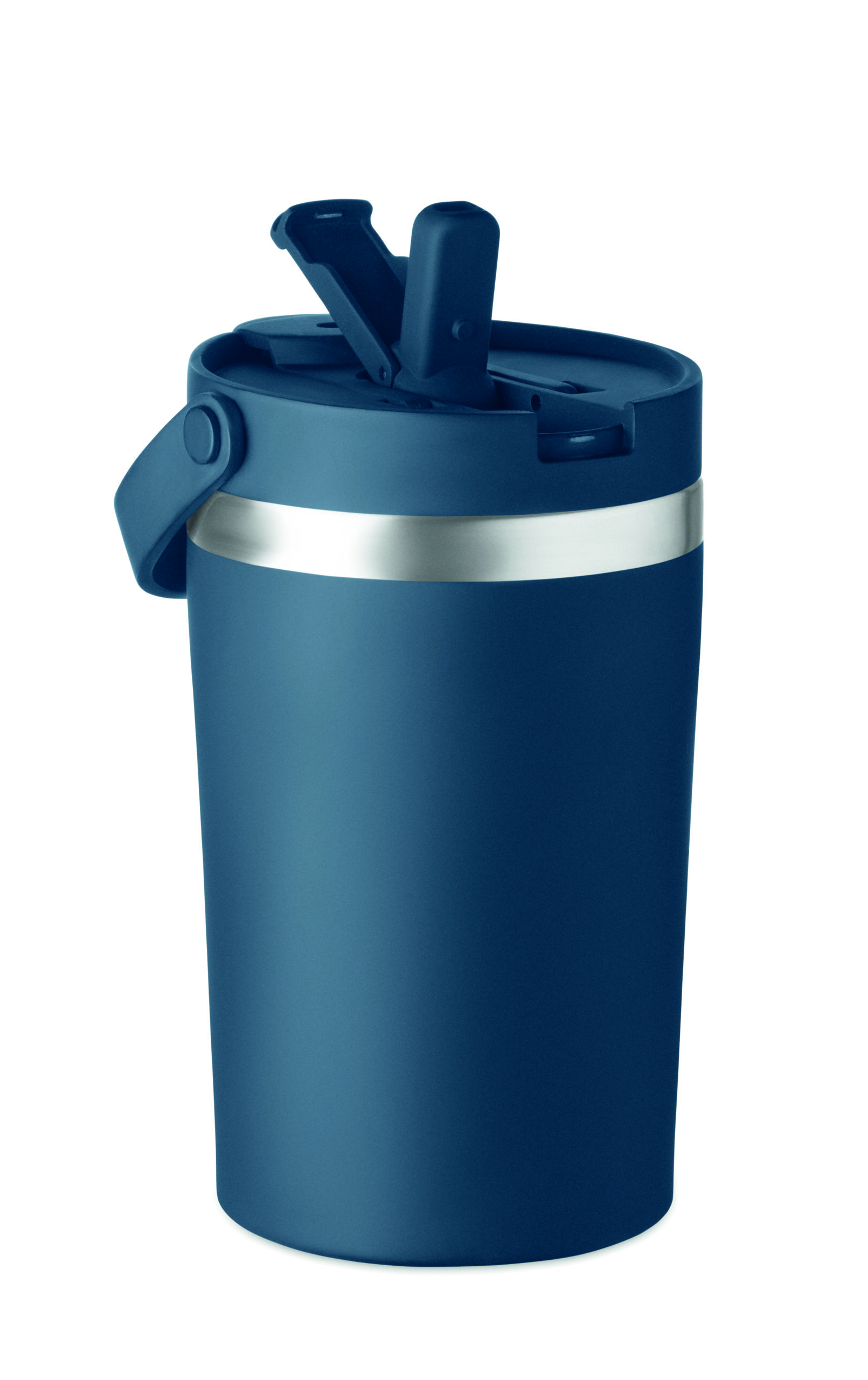 Dwuścienny kubek ze stali nierdzewnej (90% stal nierdzewna z recyklingu i 10% stal nierdzewna) z pokrywką z PP 2 w 1 i słomką oraz paskiem z RPET. Nie przecieka i jest wytrzymały. Pojemność: 350 ml.