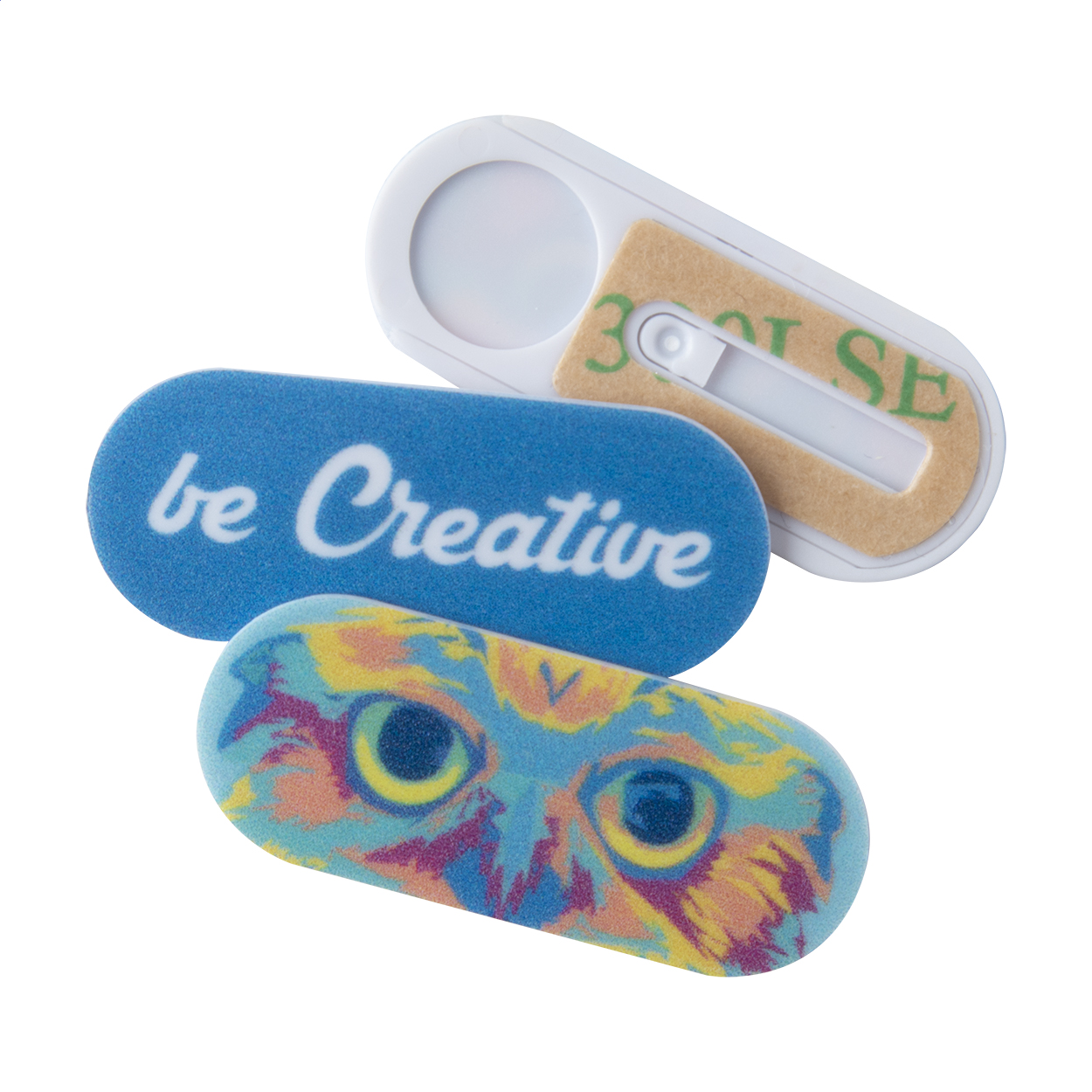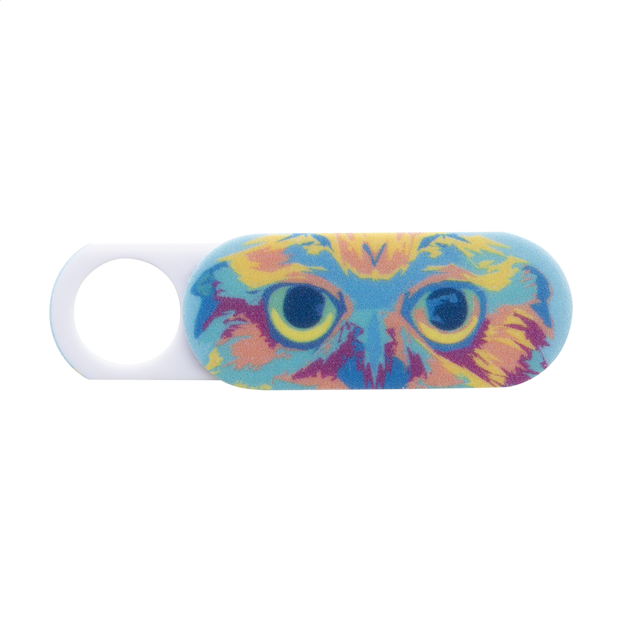 Personalizowana, zadrukowana w full kolorze, plastikowa, anty szpiegowska osłona kamery (przesuwana). Wraz z drukowaną cyfrowo papierową kartą. Cena zawiera nadruk cyfrowy na froncie karty i UV LED na osłonie. Min. ilość: 100 szt.