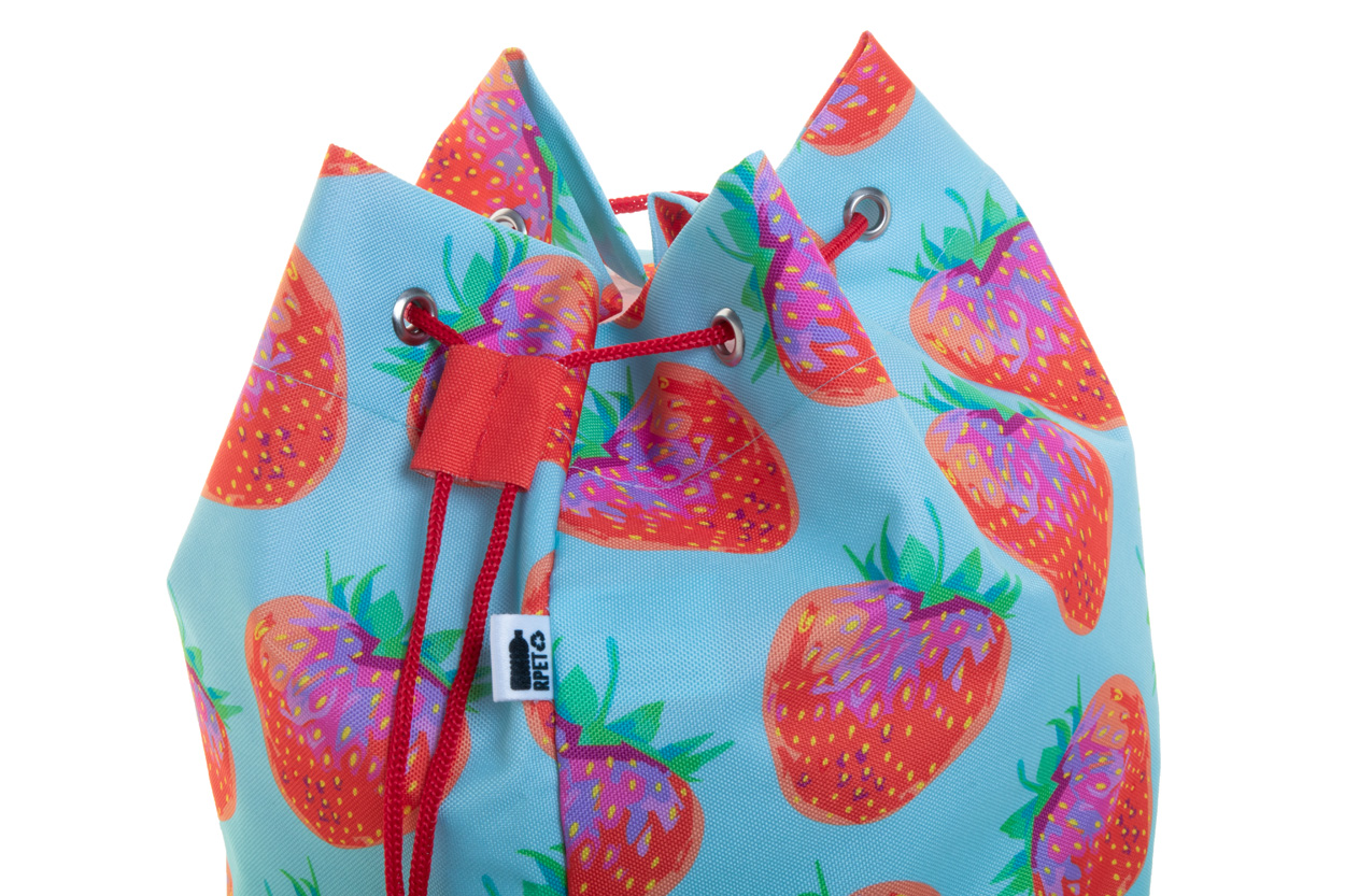 Wykonany na zamówienie worek żeglarski z poliestru 600D RPET, z kolorowymi sznurkami. Z nadrukowaną grafiką sublimacyjną i charakterystyczną metką RPET. Min. ilość: 25 szt.