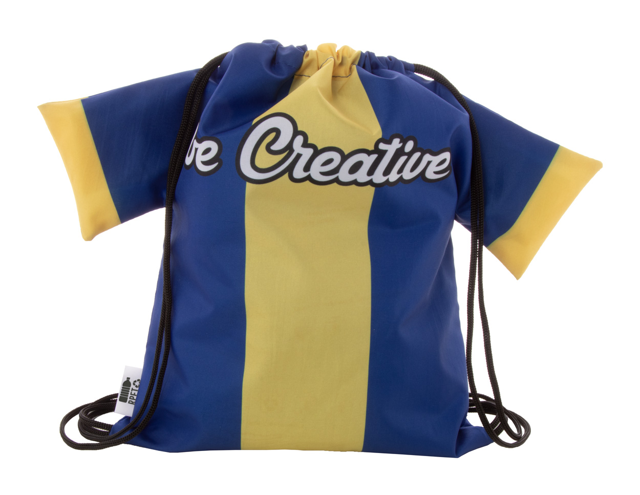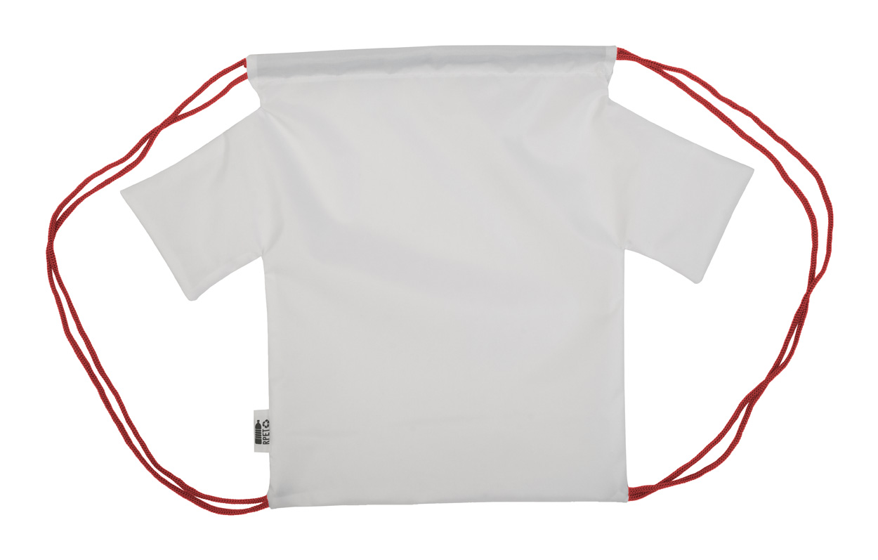 Personalizowany worek ze sznurkami dla dzieci w kształcie koszulki, poliester 190T RPET. Z nadrukowaną grafiką sublimacyjną i charakterystyczną metką RPET. Min. ilość: 25 szt.