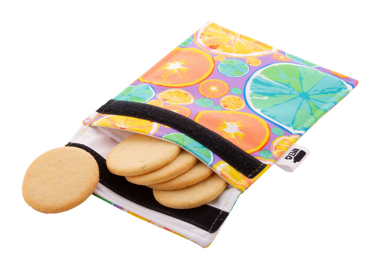 Personalizowana torba na przekąski wielokrotnego użytku z poliestru 600D RPET z trwałą, wodoodporną podszewką i zapięciem na rzep. Idealna do przekąsek lub kanapek. Z nadrukowaną grafiką sublimacyjną na całej powierzchni. Min. ilość: 25 szt.