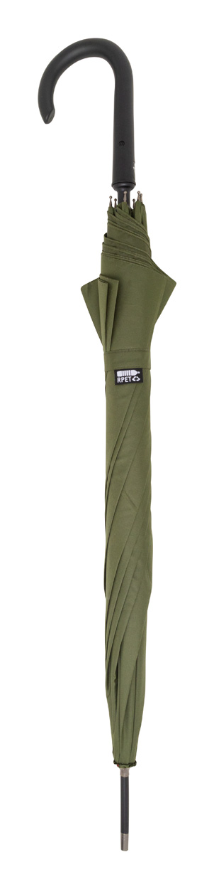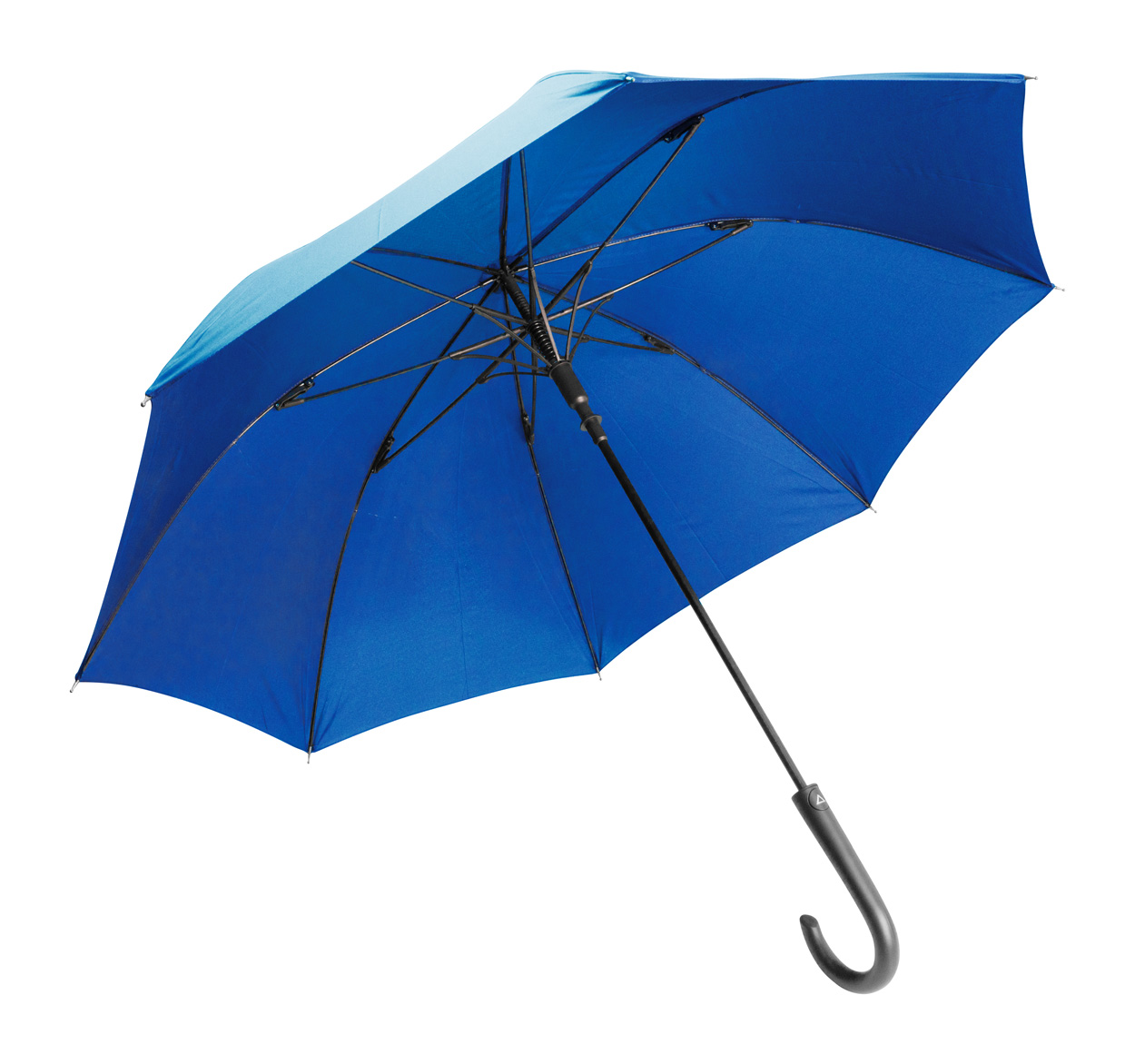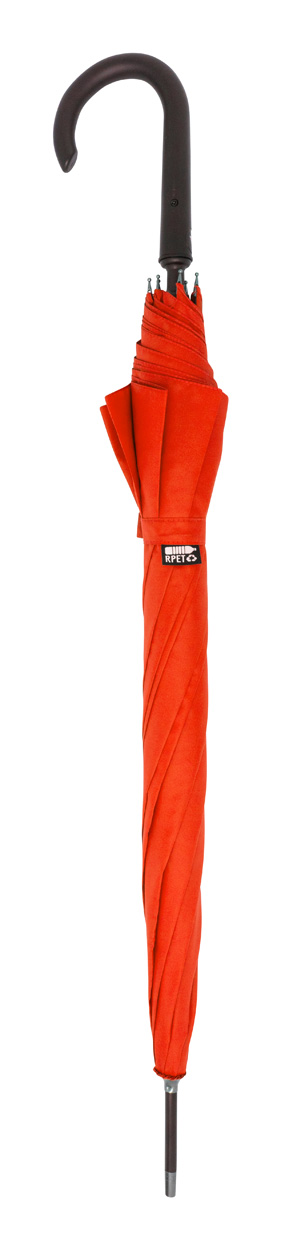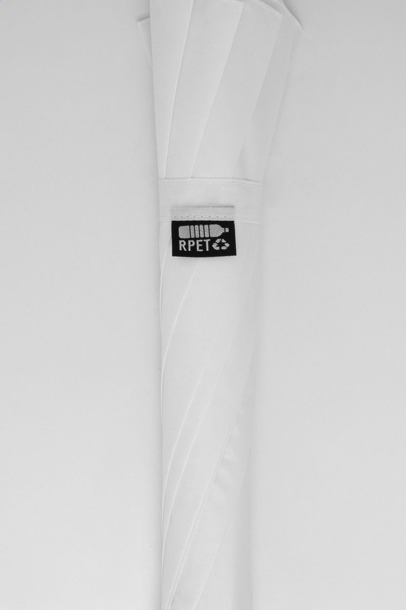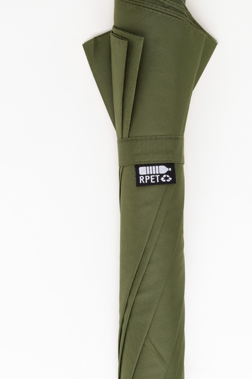 Automatyczny, wiatroszczelny parasol z 8 panelami, ramą z włókna szklanego, metalowym trzonkiem i zakrzywionym uchwytem ABS. 190T RPET pongee. Z charakterystyczną metką RPET.